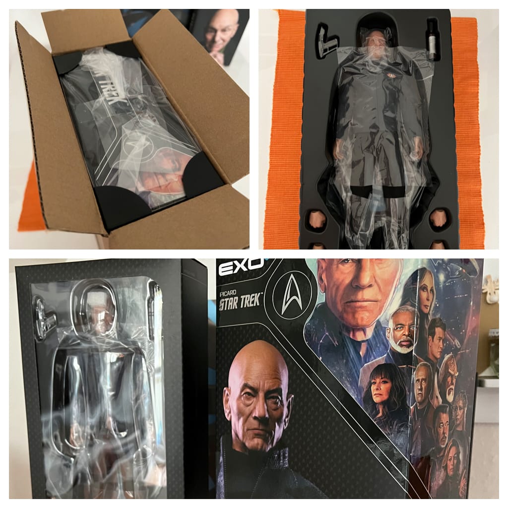 Als die auf Star Trek-Figuren im Maßstab 1:6 spezialisierte Firma EXO-6 im April des vergangenen Jahres ankündigte, diverse Figuren aus der dritten Staffel von Picard umsetzen zu wollen – unter anderem eben Admiral Picard –, war ich direkt Feuer und Flamme! Ich hatte insgesamt so meine Schwierigkeiten mit der Serie, aber Staffel 3 hat aus vielerlei Gründen meinem Fan-Herz größtmögliche Glückseligkeit beschert. Und als am 14. September die Vorbestellung startete, war ich natürlich direkt dabei. Zumal die Figur zum Preis von 190 Dollar (Versand kam wie üblich obendrauf und liegt bei pauschal 25 Dollar) überraschend günstig ausgefallen ist für eine Figur in der Größe mit der Lizenz und vor allem in der gebotenen Qualität. Und schon Ende Dezember, genauer: am 29.12., ist Admiral Jean-Luc Picard bei mir eingezogen. Und um das schon mal vorwegzuschicken: Das Beste kam in diesem Fall wirklich zum Schluss.