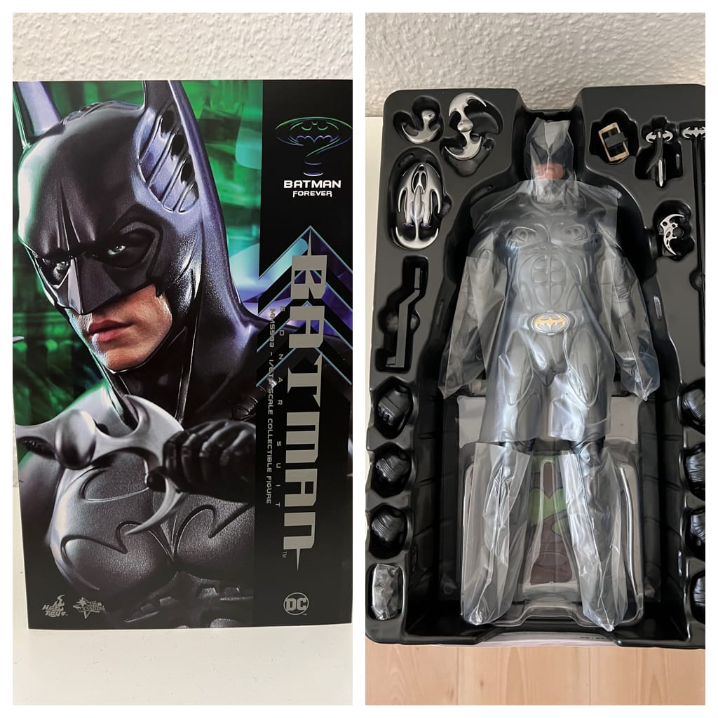 Die Figur, um die es mir hier und heute geht, Batman in seinem Sonar-Anzug, wie er im Film Batman Forever von Val Kilmer portraitiert wurde, ist auf Fotos erstmals im Februar 2021 von Hot Toys gezeigt worden. Ich habe mein Exemplar an Silvester 2022 bestellt, geliefert wurde Batman vor wenigen Tagen. In einigen Shops ist immer noch von Vorbestellung die Rede. Dies nur als kurzer Exkurs, warum man sich zwischen den ersten Fotos, die Hot Toys veröffentlicht und die vielleicht Speichelsturz und Haben-wollen-Reflexe auslösen, und dem Moment des tatsächlichen Auspackens einer Figur mitunter einiges an Geduld antrainieren muss. Ähnliches gilt sicher auch für andere Hersteller von Figuren dieser Größe.