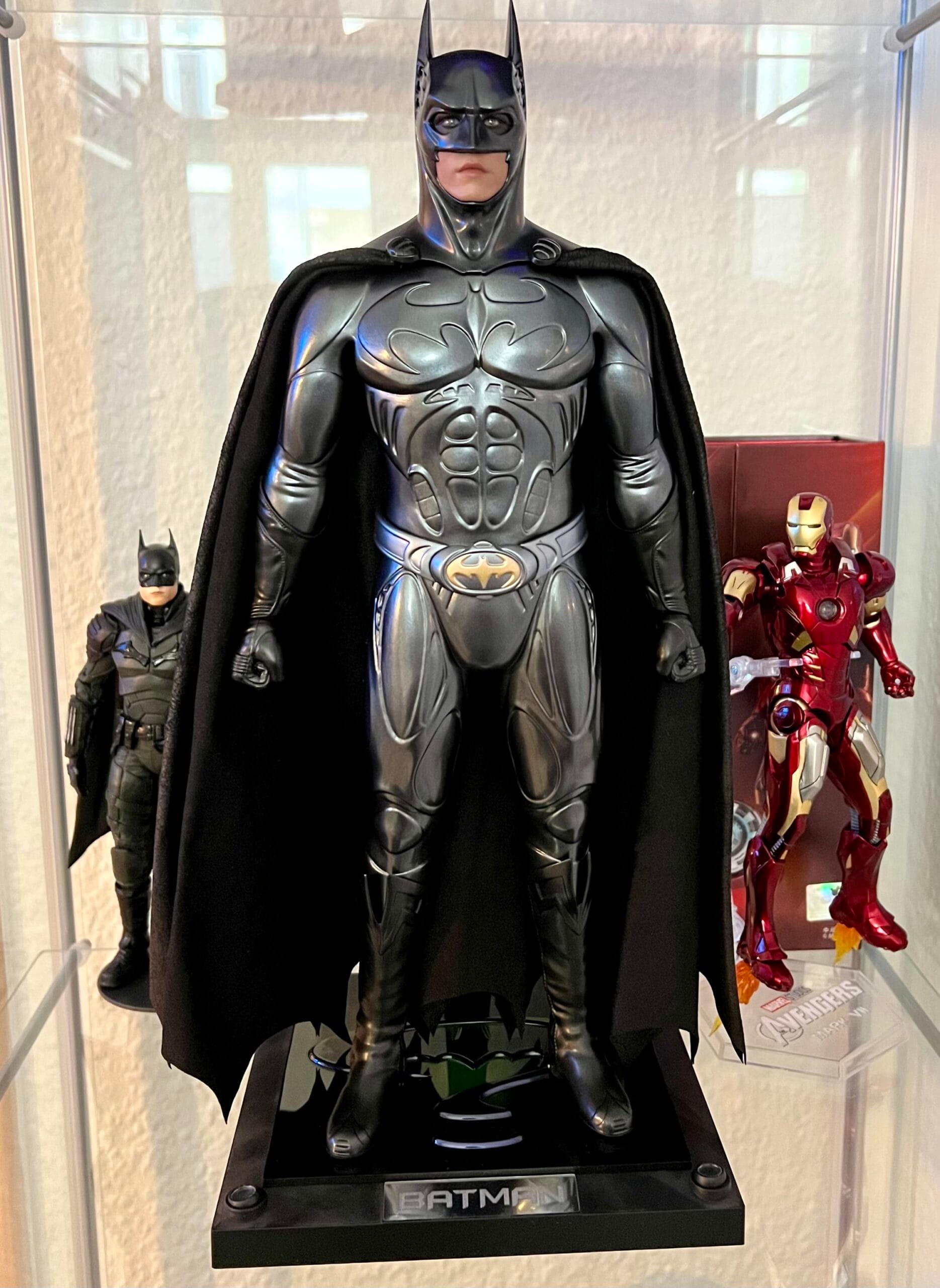 Batmans Anzug erscheint mir eher einfach gehalten, das ist aber wohl auch einfach der Vorlage geschuldet. Wer Freude daran hat, die Figuren zu posieren und fotografisch in Szene zu setzen, kann da sicher noch einiges mehr herausholen. In meinem Haushalt wird auch dieser Batman in der sogenannten Museumspose in die Vitrine einziehen. Sprich: So wie er in der Packung lag, wird er auch herumstehen, allenfalls ganz leichte Modifikationen. Wobei der starre, eher neutrale Gesichtsausdruck, der durchaus die gewünschte Ähnlichkeit zu Val Kilmer aufweist – sofern man das nur anhand der Mundpartie sagen kann – im Falle eines Batmans bei Actionposen auch nicht weiter störend/irritierend ist. Bei Figuren wie beispielsweise dem schon erwähnten Dr. Strange, der hier ebenfalls herumsteht, würde es mich persönlich irritieren, wenn ich ihn in eine besonders spannende Actionpose aufstellen würde und mich Dr. Stephen Strange weiterhin in dem gleichen, recht neutralen Gesichtsausdruck anstarren würde. Resting-Bitchface-Syndrom hin oder her, aber das ginge mir dann doch zu weit. Das mag aber jeder Sammler ganz individuell betrachten.