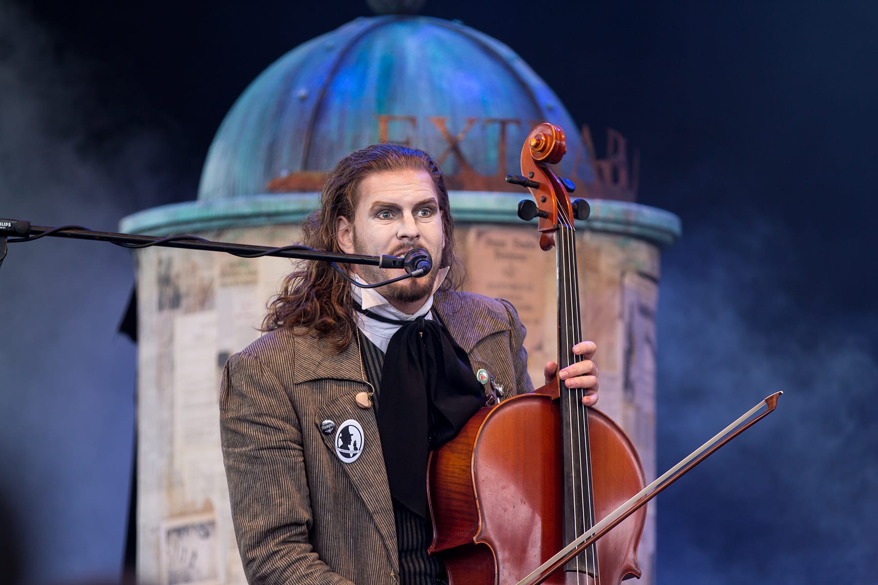 Es gibt so Bands, da wirste irgendwie nie so richtig Fan von, freust Dich aber dennoch, wenn sie irgendwann irgendwo aufspielen, und nimmst sie mit. Coppelius ist eine dieser Bands. Die mag ich live echt total gerne, würde auch spontan zu einem Konzert anreisen, wenn eines in meiner Gegend stattfände. Von CD aber, da kicken mich Coppelius irgendwie nicht. Das ist für mich eine dieser Bands, die ich unter „geborene Live-Band“ verbuche. Die Meinung diesbezüglich wurde von den Herren von Coppelius hier einmal mehr untermauert. Spielfreudig wie immer kämpften sie gegen das gar nicht mal so gute Wetter an und schafften es, dem anwesenden Publikum Bewegung, wenigstens aber ein zufriedenes Lächeln zu entlocken. Meine Herren, ihr dürft gerne wieder nach Gelsenkirchen reisen, vielleicht dann mit einer dankbareren Platzierung im Spielplan.