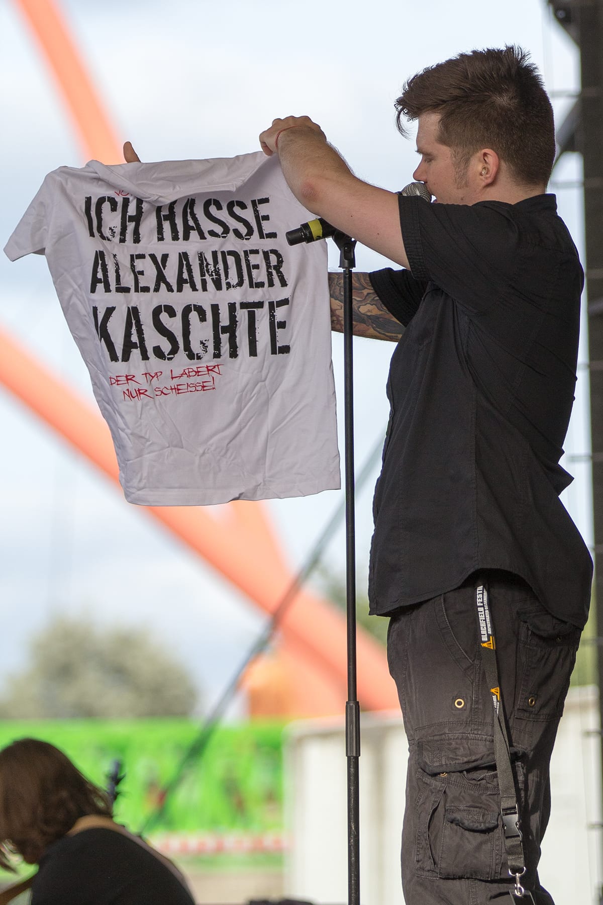 Ich muss gestehen, mit dem Tun Alex Kaschtes verbindet mich so eine Art Hassliebe. Musikalisch bin ich Fan seiner früheren Werke (bis zu Tineoidea, A.ura gerade noch so), live war das noch nie so meine Baustelle. Aber Vorurteile sollen ja gepflegt werden, daher fand ich mich dann doch vor der Bühne wieder. Es bekam dem Konzert sehr gut, dass sich auch so manch älteres Stück in der Setlist wiederfand. Noch besser jedoch war der Umstand, dass Kaschte nicht nur das Publikum im Griff hatte (spontane Polonaise inbegriffen) wie keine andere Band dieses Festivals, sondern er auch nicht zu knapp mit selbstironischen Ansagen gespart hatte. Unvergessen bleiben wird wohl das Hochhalten des T-Shirts mit der Aufschrift „Ich hasse Alexander Kaschte. Der Typ labert nur Scheiße“.
