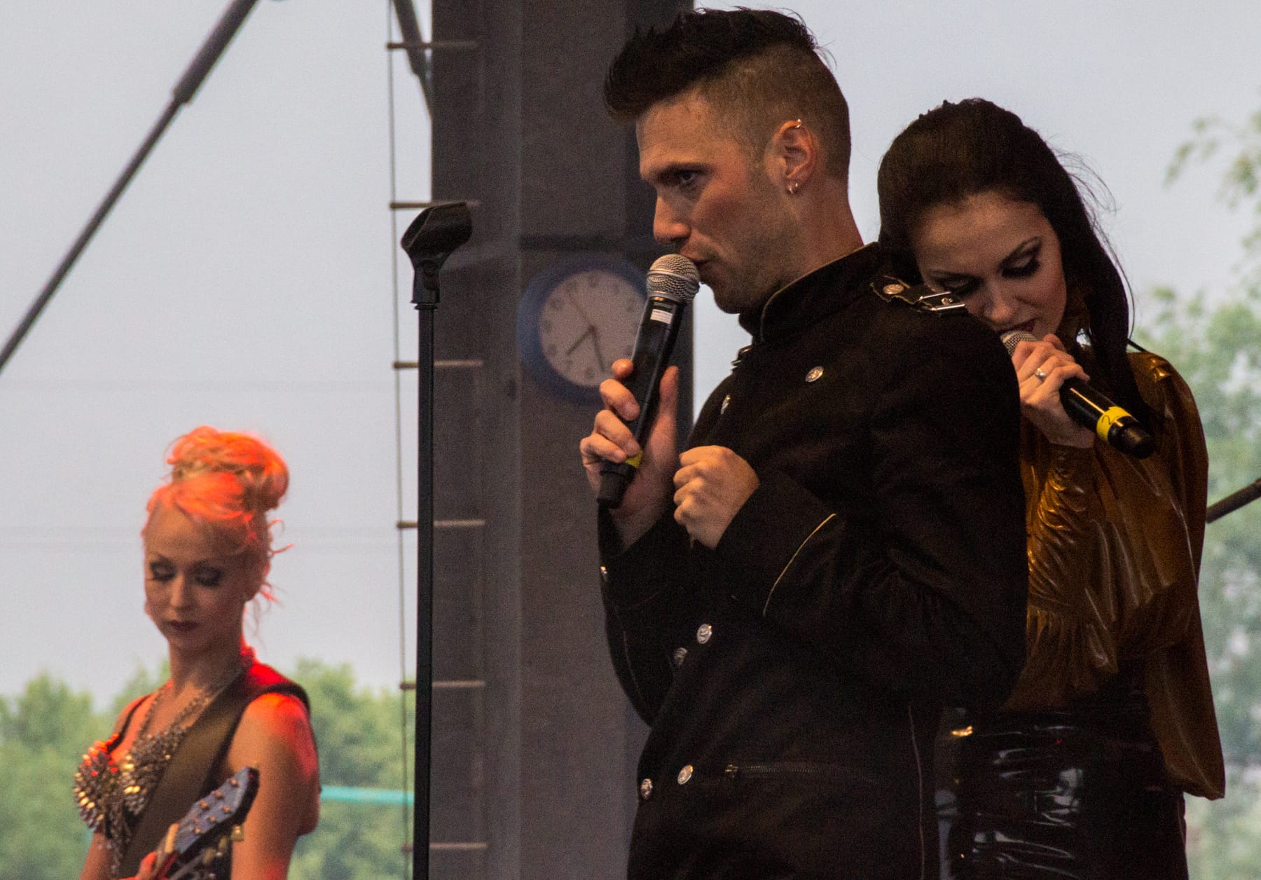 Ha, endlich hat es mal geklappt, Rotersand zu gucken. Die Musik der Band höre und schätze ich schon eine ganze Weile, in Bezug auf ein Konzert kam immer irgendwas dazwischen. Sei es nun, dass ich ihren Auftritt auf dem Blackfield 2009 meine Kontaktlinse suchend vom Zeltplatz aus gehört habe oder die Auftritte der Band aufgrund gesundheitlicher Probleme von Sänger Rascal ausgefallen oder verschoben wurden. Krischan und Rasc taten gar nicht erst so, als würde irgendwas von der Musik live eingespielt werden. Vielmehr betätigte sich Krischan vornehmlich als DJ, während Rasc mit tollem Gesang seine Qualitäten als Entertainer unter Beweis stellte. Rotersand hatten ganz offensichtlich mehr als Bock, für die Gäste zu spielen. Es war ihnen deutlich anzusehen, dass es für sie die reinste Wohltat war, hier in Gelsenkirchen auf der Bühne zu stehen und mit dem Publikum zu feiern. So kam es immer wieder zu magischen Momenten.