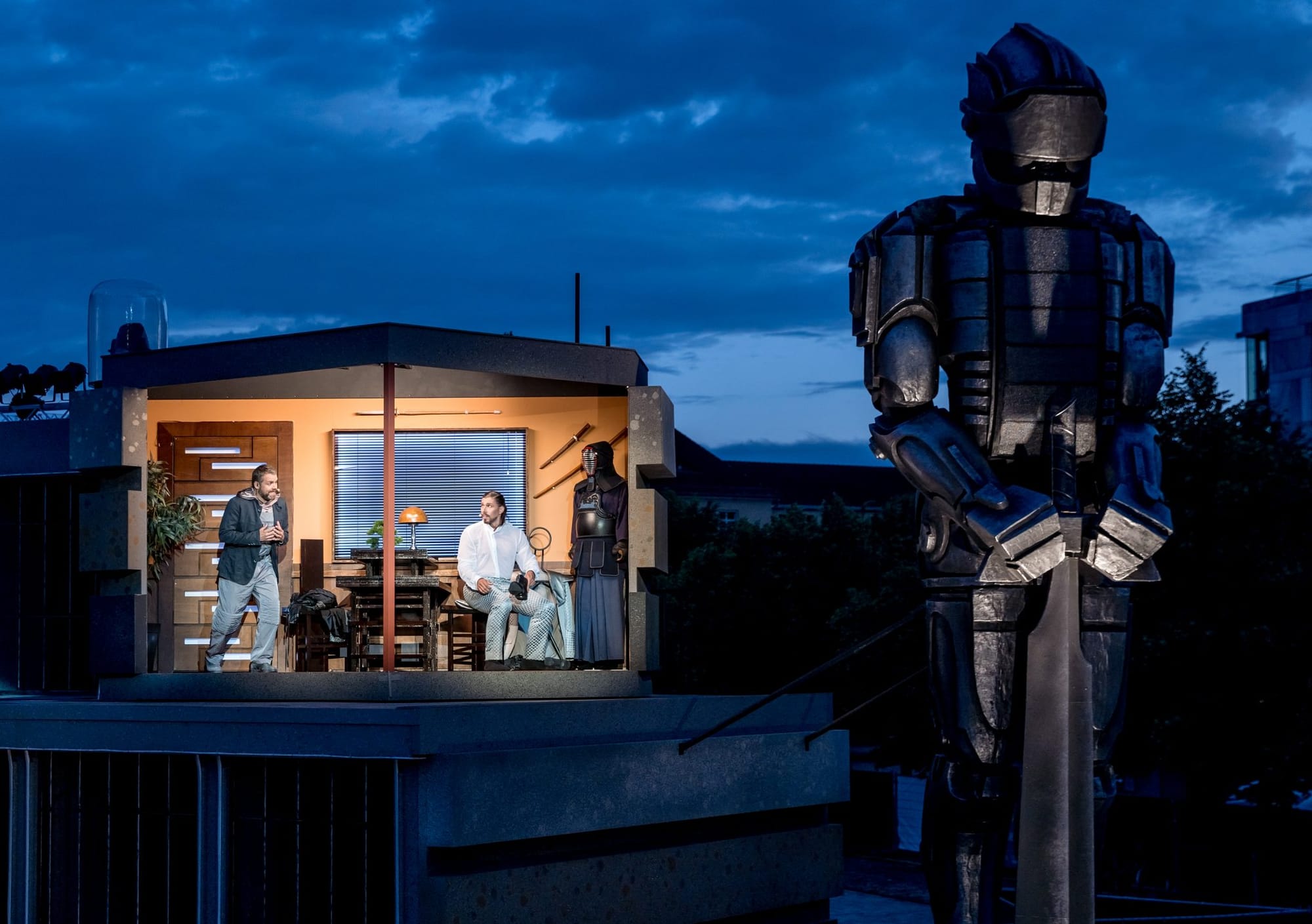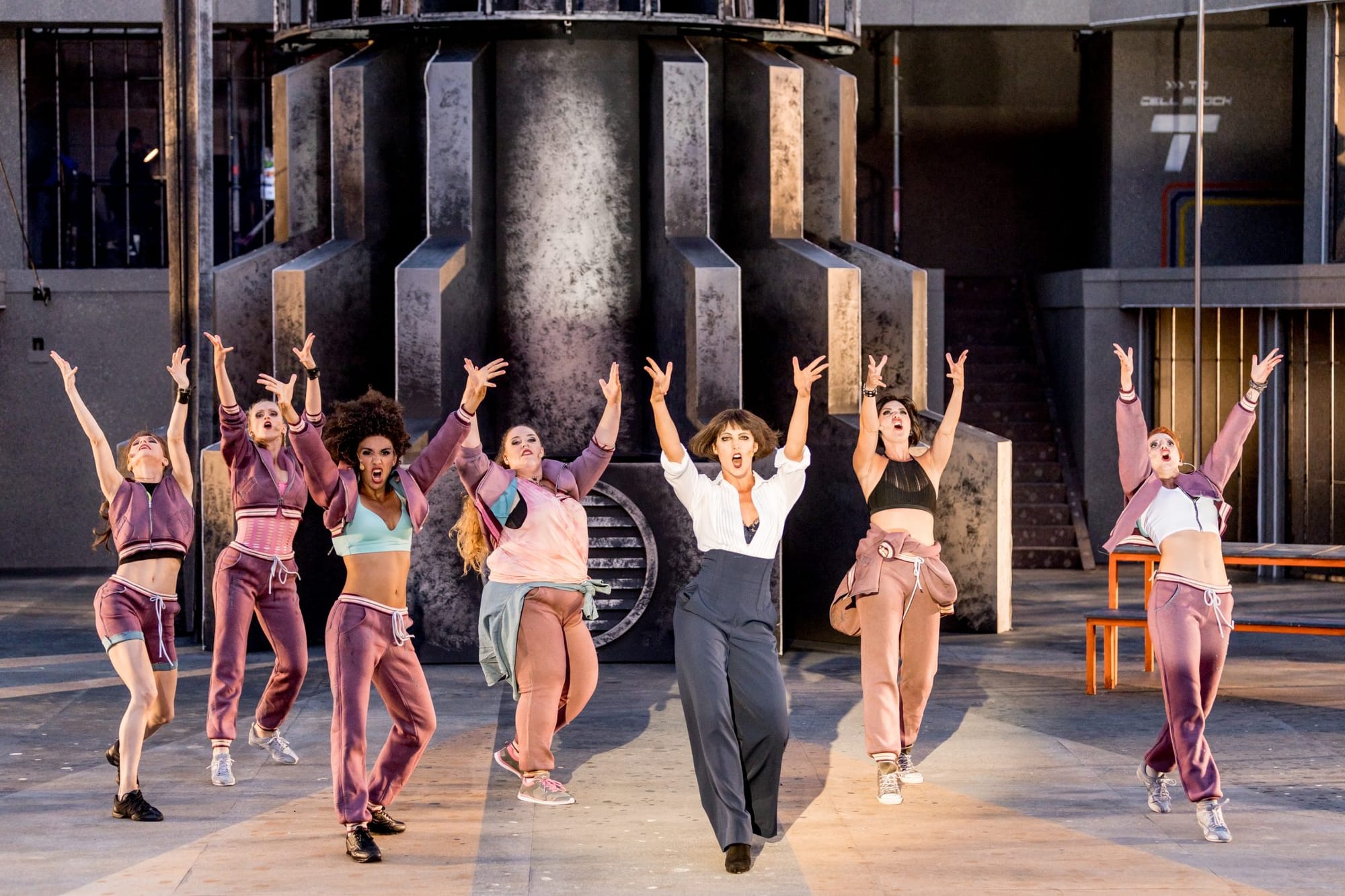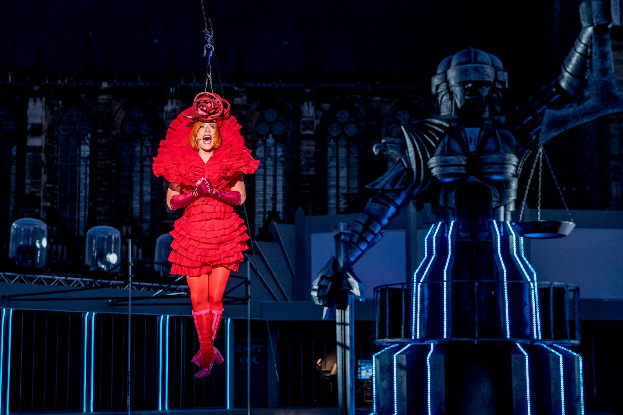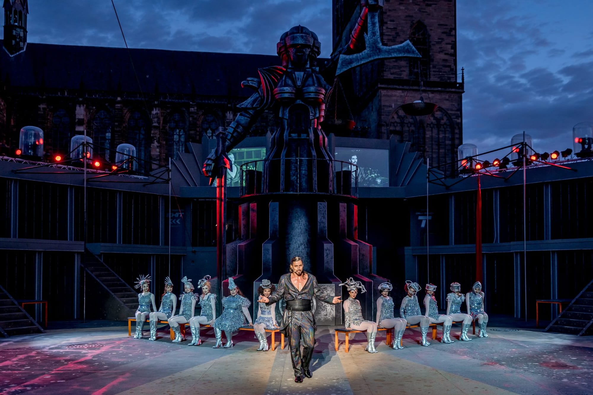 Wie weiter oben schon erwähnt, ist Chicago eher so was ein Kammerstück, es bestand also die Gefahr, dass das Ensemble auf einer sehr viel größeren Bühne wie bei dieser Open-Air-Veranstaltung ein wenig verloren wirkt. Dem entgegengewirkt wurde durch die schon wieder außergewöhnlich sehenswerte Bühne, die Leif-Erik Heine entworfen hat. In Magdeburg hatte Heine schon beispielsweise bei Pippi Langstrumpf und Der kleine Horrorladen seine Kreativität und visuelle Ausdruckskraft unter Beweis stellen können. Die Bühne wurde zum großen Teil von einer riesigen, blinden Justitia eingenommen, die ein wenig an Fritz Langs Film Metropolis denken ließ – und den irgendwo retro-futuristischen Charakter dieser Inszenierung unterstützte. Flankiert wurde Justitia von zwei großen Rittern, die mich wiederum an RoboCop erinnerten. Dass am Anfang des Stücks von OCP (im Film RoboCop die Firma, die den Blechbullen auf Verbrecherjagd schickt) die Rede ist, dürfte daran nicht ganz unschuldig sein. Pfiffige Idee, die Lautsprecher in diese Ritter einzubauen und damit quasi auf ganz elegante Weise verschwinden zu lassen. Durch diese Aufbauten sowie den Umstand, dass die Bühne wie eine Ellipse konstruiert schien, die Zellen von Roxie und Velma jeweils an den Scheitelpunkten, wirkte sie nicht so übermäßig groß. Eine geschickte Verteilung aller Protagonisten und der daraus resultierenden, sinnvollen Raumausnutzung tat ein Übriges.