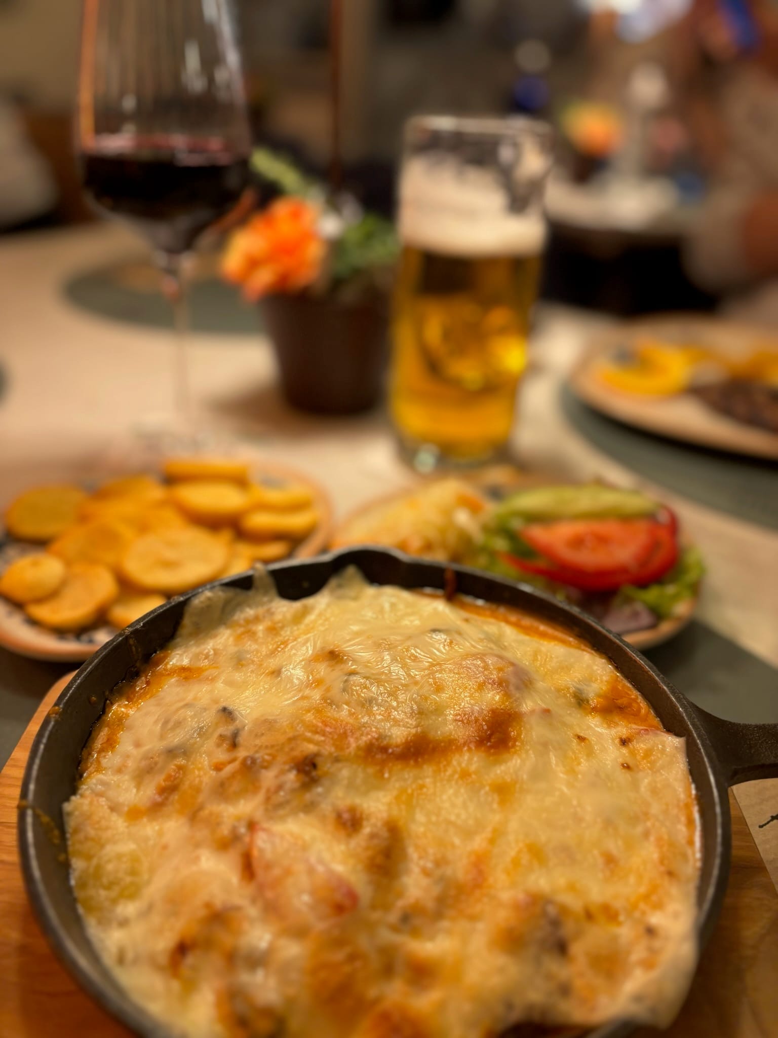 Nicoles Essen mussten wir zudem postwendend wieder zurückgehen lassen. Nachdem sie die Schicht überbackenen Käses angeschnitten hatte, kam zum Vorschein, dass das Gyros in einer Flüssigkeit schwamm. Nicht die Metaxasoße, sondern Öl. Eindeutig viel zu viel Öl. Das verkam zu einer Suppe, die nicht im Ansatz appetitlich war. Der herangewunkene Kellner nahm nach einem kurzen, prüfenden Blick das Gericht wieder an sich und versprach einen Austausch. Dieser kam auch irgendwann, allerdings dauerte es dieses Mal wesentlich länger als zuvor. Dadurch hatte ich mein Essen in der Zwischenzeit schon komplett verputzt. Das Ersatzgericht war jedoch in Ordnung und durchaus lecker. Schade allerdings, dass die Wartezeit nicht irgendwie überbrückt wurde. Nicoles Kartoffelchips waren längst kalt, als das Austauschessen kam. Hier hätte man gerne den kompletten Bums ersetzen können. Oder die Wartezeit mit einem kleinen Getränk oder was auch immer überbrücken können. Es wurde also nicht ganz so serviceorientiert agiert, wie wir uns das gewünscht hätten.