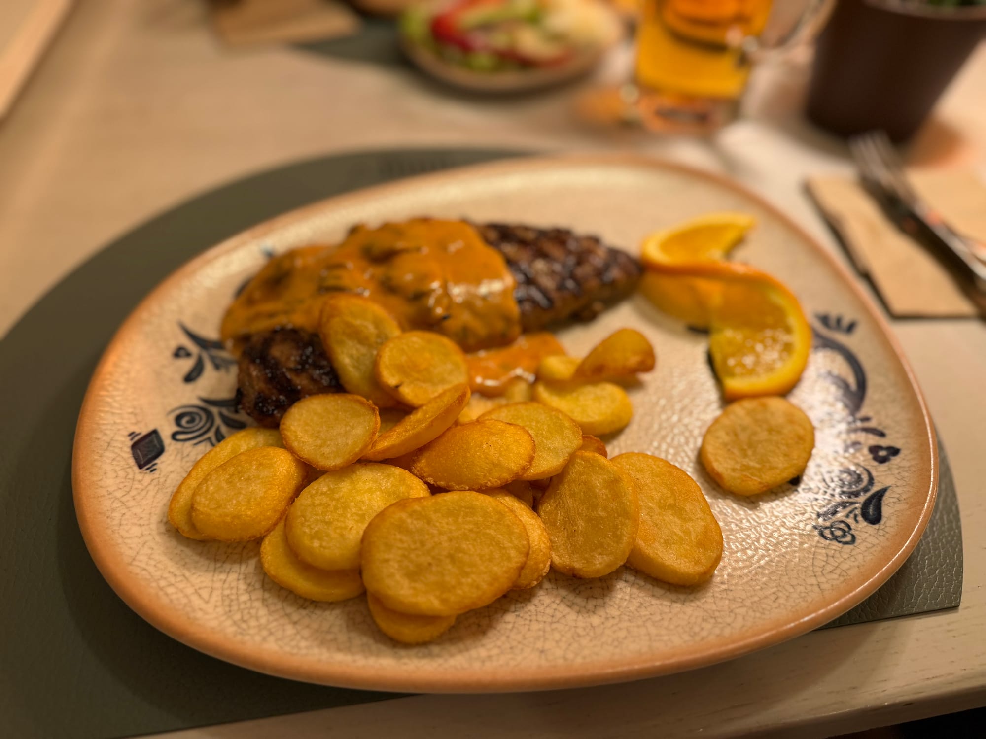 Monieren mussten wir allerdings etwas anderes. Flink, wie die Leute im Astería offensichtlich sind, dauerte es nach dem letzten Bissen des Salats abermals nicht lange und die jeweiligen Hauptgerichte standen auf dem Tisch. Allerdings: Dieser Hackfleischklops namens Bifteki und die paar Kartoffelchips wirkten auf dem Teller doch sehr überschaubar. Daran änderte auch die als Dekoration hingedrehte Orangenscheibe nichts. Hatte die Inflation sich auf die Portionsgrößen niedergeschlagen?
