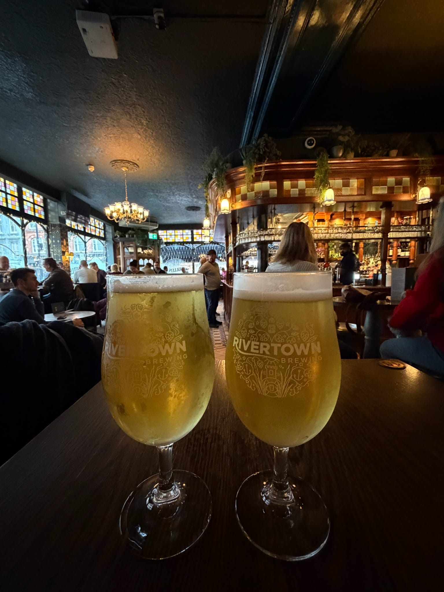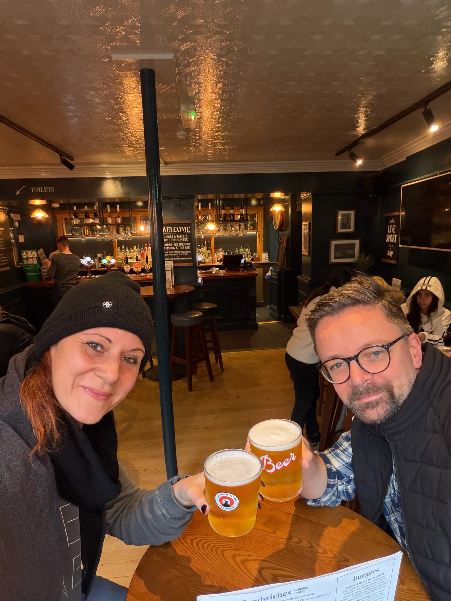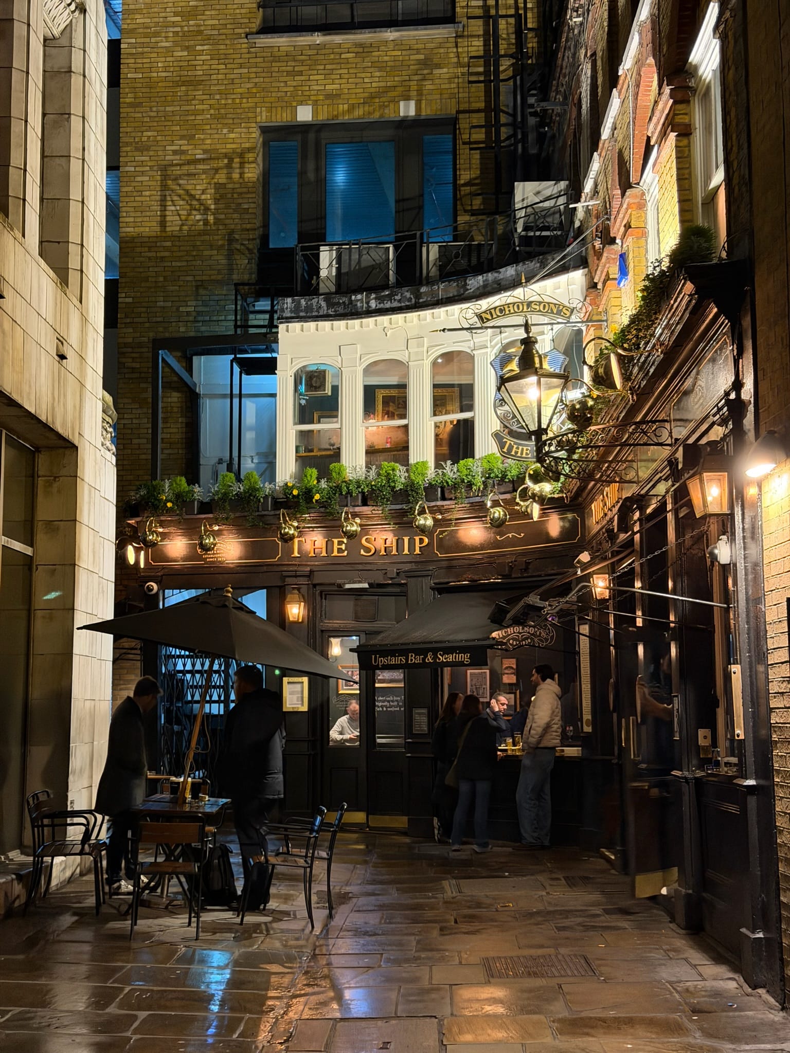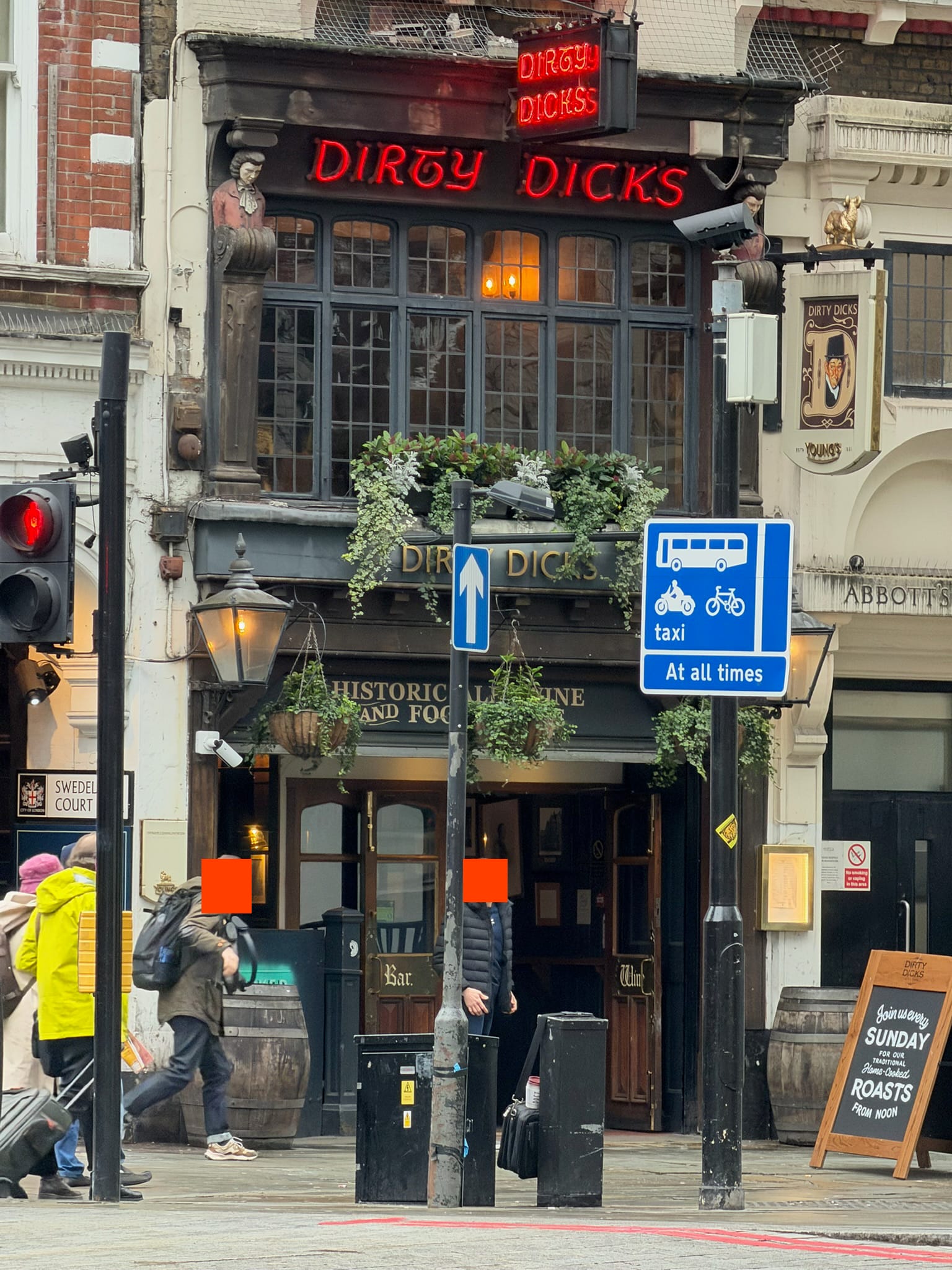 Nachdem wir gut gestärkt wieder hinaus ins Tageslicht getreten waren, setzten wir unseren Fußmarsch in Richtung Whitechapel fort. Der immer wieder auftretende Regen, der Umstand, dass der Wind einen unserer Regenschirme in die ewigen Jagdgründe geschickt hatte, und die Tatsache, dass sich eine leichte Mauligkeit bei den Reiseteilnehmern Eurer Herzen eingeschlichen hatte, sorgten dafür, dass wir noch einmal in ein ziemlich uriges Pub einkehrten. Logisch, es gab Bier (Name schon wieder vergessen). Hier hockten wir also nun in dieser Gastlichkeit, und während wir unsere Klamotten trocknen ließen, beobachteten wir das rege Treiben. Schon am frühen Nachmittag war die Bude voll, es war wunderbar lebhaft. Überhaupt waren die Pubs stets zu jeder Tageszeit, zu der wir einkehrten, gut besucht. Von Locals, nicht von Touris wie uns. Zur Zeit des gepflegten Feierabendbierchens herrschte selbst draußen vor den Pubs teilweise dichter Andrang! Dass drinnen nicht geraucht werden durfte, hatte daran sicher einen Anteil.
