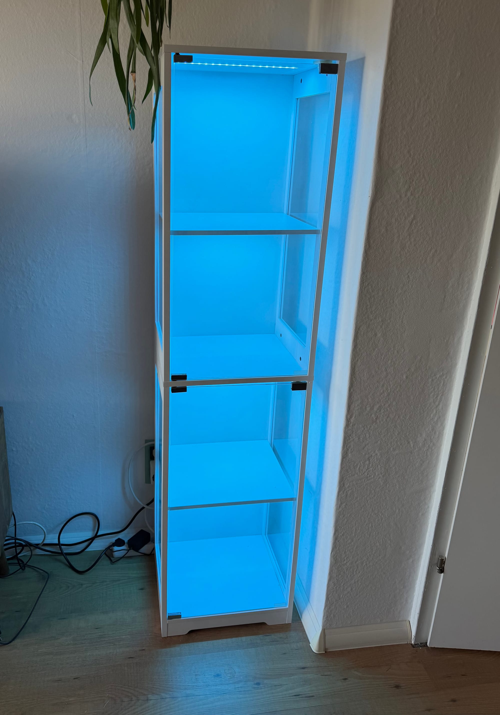 Die Beleuchtung gefällt mir gut. Schön wäre, wenn sich die Vitrine merken würde, welchen der drei Lichtmodi man zuletzt verwendet hat. Sollte sich die Vitrine das merken, ist es mir zumindest nicht aufgefallen. Insgesamt ist sie aber ein sehr guter Ersatz für IKEAs Detolf, wie ich finde, den man sich mal mitnehmen kann, wenn er irgendwo im Angebot ist. Ich habe bei Amazon 130 Euro dafür bezahlt und werde demnächst noch die Eckvariante davon bestellen (wobei ich hier schon weiß, dass mich die schwarze Front bei dem weißen Modell etwas stören wird, da die reguläre Vitrine von vorn auch weiß ist). Ich überlege gerade, meine beiden Detolfs und Blåliden der einheitlichen Optik wegen durch diese Mopeds zu ersetzen. Es sei denn, jemand von Euch kennt noch andere Möglichkeiten, die nicht direkt hunderte Euros kosten. Oder, wie in diesem Beitrag vorgestellt, Modifikationen vorhandener Möbel erfordern.