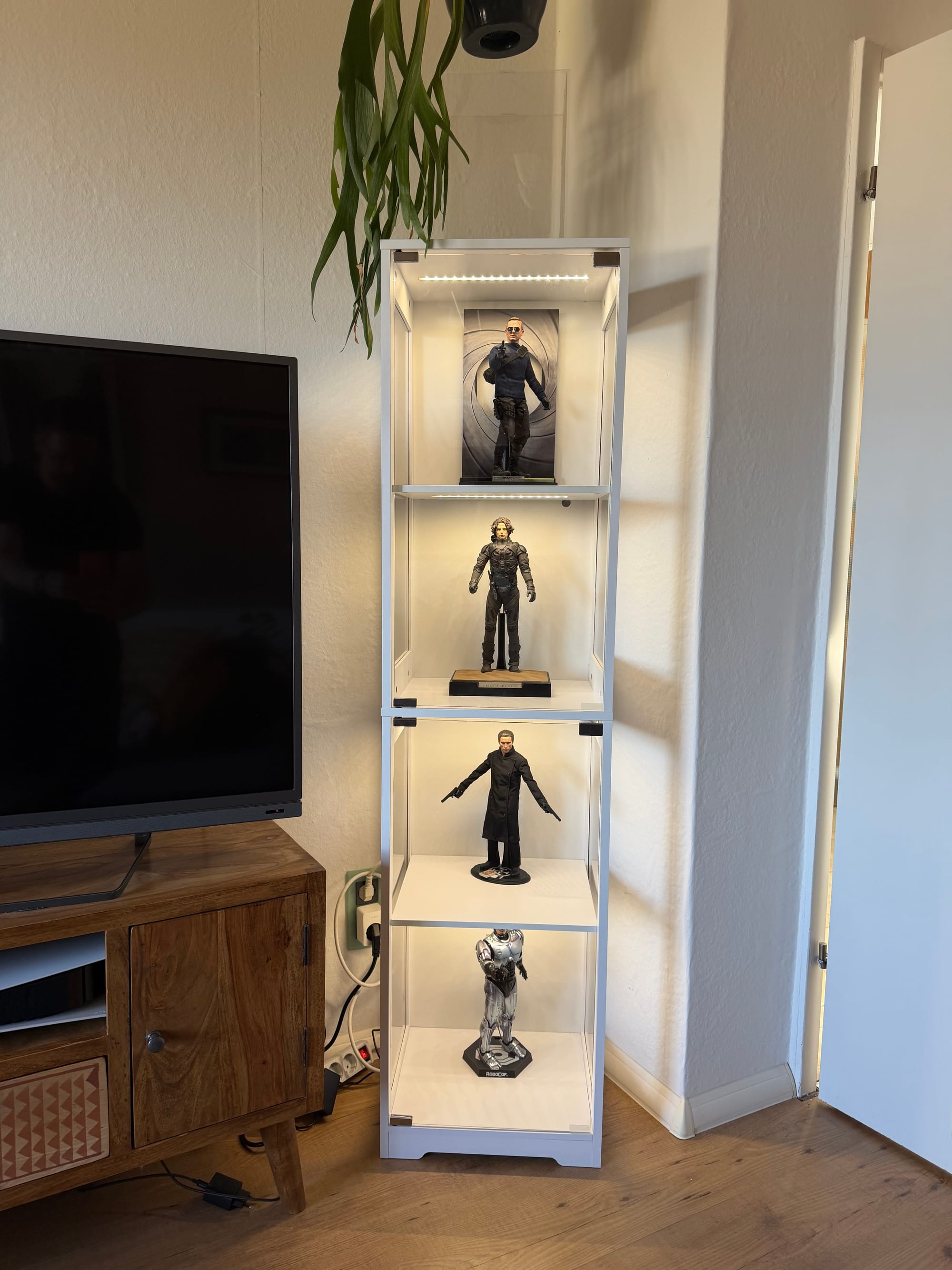 Wenn ich nicht gerade wandere, esse, reise oder irgendwas in diesen Blog reinschreibe, ist eines der großen Themen in meinem Leben das Sammeln von Figuren im Maßstab 1:6. Soweit, so vielleicht schon bekannt. In meinem Bestreben, mich von Social Media zu lösen, ist der heutige Beitrag etwas, das ich so bzw. in sehr ähnlicher Form in einer Facebook-Gruppe zum Thema Sixth-Scale-Figuren gepostet habe. Aber wie gesagt: Davon möchte ich mittelfristig weg; mein Online-Leben soll irgendwann nur noch hier im Blog stattfinden. Das jedoch werde ich die Tage in einem eigenen Beitrag vermutlich noch etwas tieferlegen. Und damit zurück zum eigentlichen Thema: Ich möchte Euch gerne mal meine beiden Neuzugänge vorstellen: die Brottar-Vitrine in Weiß. Und James Bond im Commando Outfit von Hot Toys aus No Time To Die.