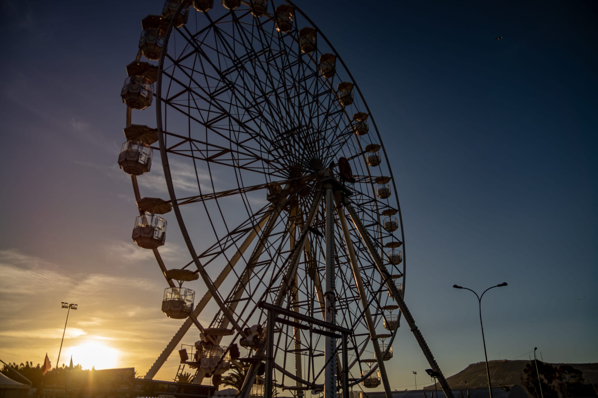 Nachdem wir die Kasbah ausführlich bestaunt hatten, ging es mit dem Bus hinab in die Stadt zur Uferpromenade. Auf teilweise ziemlich abenteuerlichen Wegen. Alleine schon der gefahrenen Route wegen hat sich diese Tour am Ende bezahlt gemacht. Zwischendurch hielten wir in der Kennedy-Allee, um die hübsche Moschee Mohammed V zu bestaunen. Wie aus Tausend und einer Nacht wirkt sie, steht da und überstrahlt die anderen Gebäude, die in ihrem manchmal heruntergekommenen 1960er-Jahre-Charme beinahe ärmlich wirken. Dabei ist die Moschee selbst ja nicht viel älter, denn auch sie wurde erst im Rahmen des Wiederaufbaus der Stadt Agadir in den 60ern errichtet. So wie Agadirselbst kann man sich das definitiv mal angesehen haben. Weiter ging es nun aber wirklich zur Uferpromenade und dort zum Riesenrad, das am Strand thront und von dem sich ebenfalls eine ganz fantastische Aussicht bietet. Zum Beispiel auf den Berg der Kasbah, auf dem ab der Dämmerung der Wahlspruch Marokkos, „Gott, Vaterland, König“, dem Meer entgegenleuchten und der noch weithin sichtbar ist.