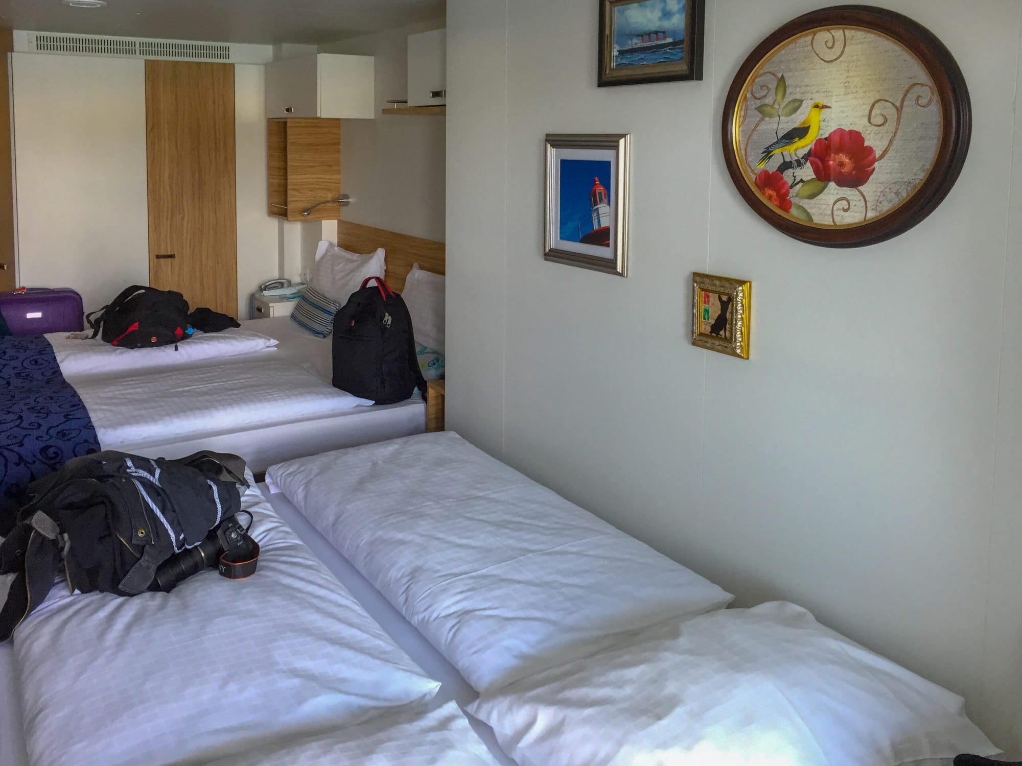 Wir entschieden uns abermals für eine Kabine auf Deck 6. Einerseits aus Kostengründen, klar, aber auch, weil wir damit gute Erfahrungen gemacht haben. Man hat kurze Laufwege zu den Restaurants auf Deck 4 und 5, die Abtanzbar ist auch nur einen Katzensprung entfernt, und sollte die See wirklich mal rau werden, dann schaukelt es weiter unten einfach weniger als weiter oben. Jedenfalls, sofern der Kahn von einer Seite auf die andere rollt. Wir beschlossen, alles aus einer Hand zu buchen. Also auch Anreisepaket, Versicherungen und was weiß ich, was noch dazugehört.