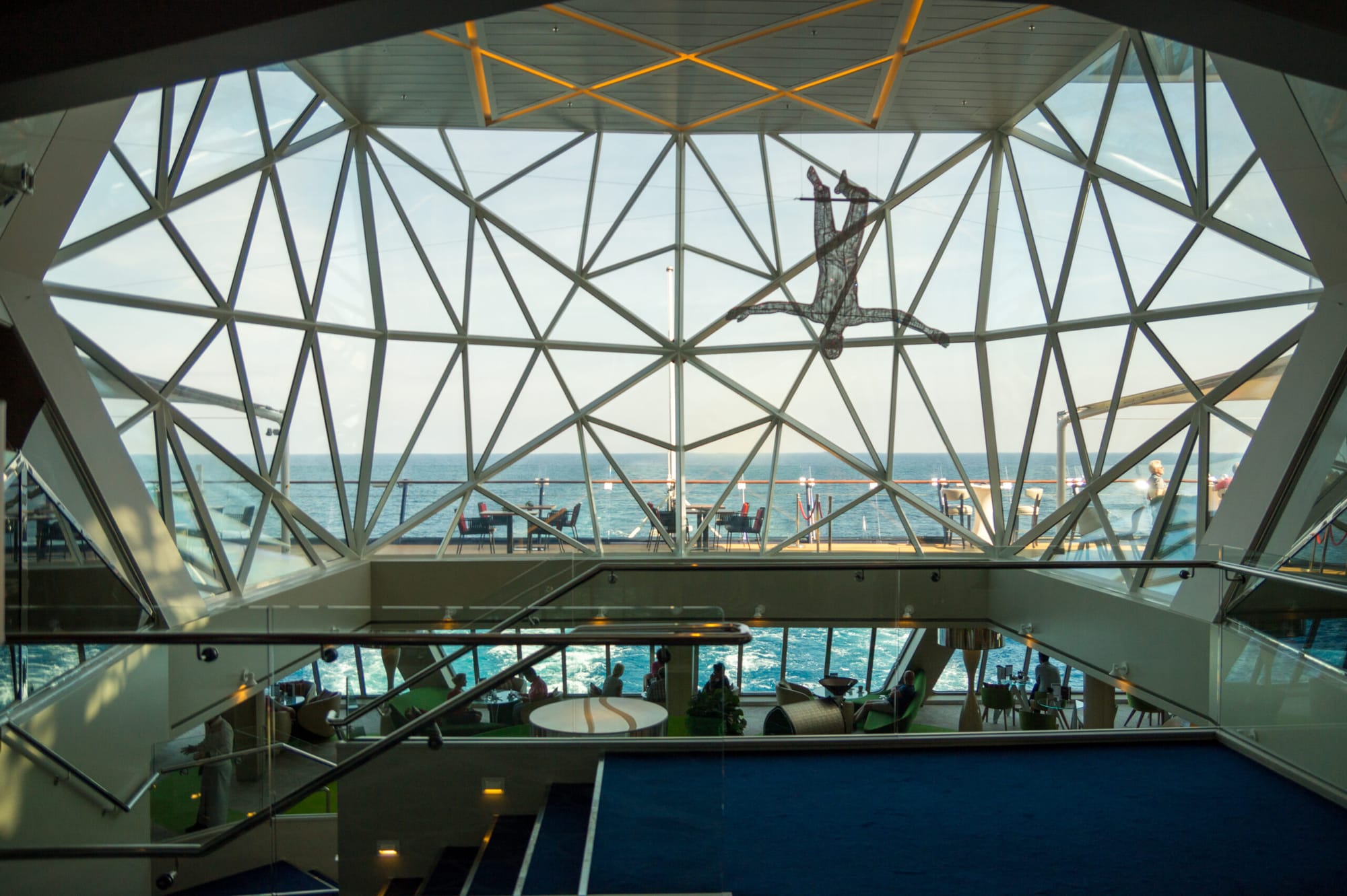 Irgendwann waren wir aber dann endlich mal durch alle Sicherheitskontrollen, Check-ins und was weiß ich nicht noch alles durch und im Bauch des Schiffes angekommen. Wie in Hotels üblich – ja, auch in den schwimmenden – sind die Hotelzimmer oder in diesem Fall Kabinen nicht gleich zugänglich. Logisch, die das Schiff verlassenden Gäste mussten bis 9 Uhr morgens raus sein, anschließend braucht das Housekeeping-Team ja noch ein bisschen Zeit, um die ungefähr 1250 Kabinen wieder fit zu machen für die neuen Gäste. Das heißt: Sich bequem auf den Balkon fläzen und wie Gott in Frankreich die ersten Liter Cocktails wegzuschlürfen, geht erst ab 15 Uhr. Ganz egal, wie sehr Ihr mit den Füßen strampelt. Und ja, es gibt Leute, die tun das. Aber Querköppe, die grundlos immer was zu mosern haben, gibt es wohl überall. Wie sagt man… auf jedem Schiff, das schwimmt und schwabbelt, ist mindestens einer drauf, der dämlich sabbelt. Kurzum: In die Kabine kann man möglicherweise zwar nicht sofort, dafür aber alle anderen öffentlichen Bereiche bereits vollumfänglich nutzen.