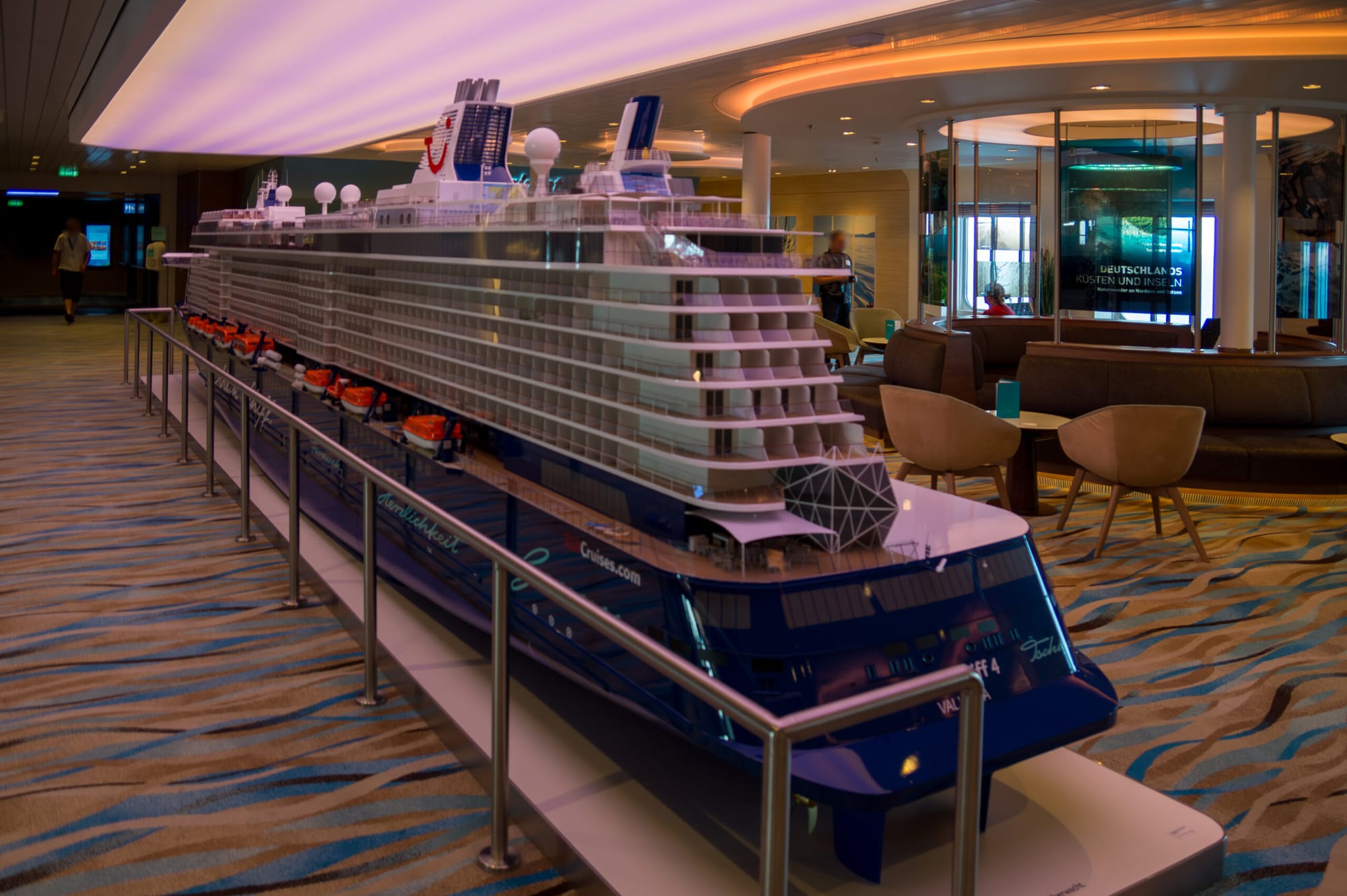 Sinnvollste Änderung im Rahmen des Neubaus: Das Meerleben, jenes maritime Naturkunde-/Technikmuseum, das einen großen Bereich auf der MS3 einnimmt und auf Deck 4 gegenüber dem Spielplatz oder der Malstube gelegen ist, musste auf der MS4 der Waterkant Bar weichen. Eine neue Bar, die es vorher nicht gab, hell und freundlich gestaltet und insofern sinnvoll, als sie vorrangig an Seetagen an den übrigen Bars im Hinblick auf das Gastaufkommen für zusätzliche Entspannung sorgt. Auf der 3 fand ich das Meerleben eigentlich noch ganz prima, aber mal ehrlich: Mehr als einmal werden wohl die wenigsten durch diese Dunkelkammer geschlichen sein. Der Platz konnte wirklich besser genutzt werden. So wie eben hier geschehen. Außerdem wird der Bereich von einem etwa 8 Meter langen Querschnittsmodell der Mein Schiff 4 geziert, für die TUI Cruises ein paar Hunderttausend Euro hat springen lassen. Dieses Modell gewährt Interessierten einen Einblick in die Innereien des Ozeanriesen, die man sonst nie zu Gesicht bekommt. Ich war so angetan davon, dass ich da nicht nur ewig drumherumgeschlichen bin, sondern das Teil am liebsten mit nach Hause genommen hätte.