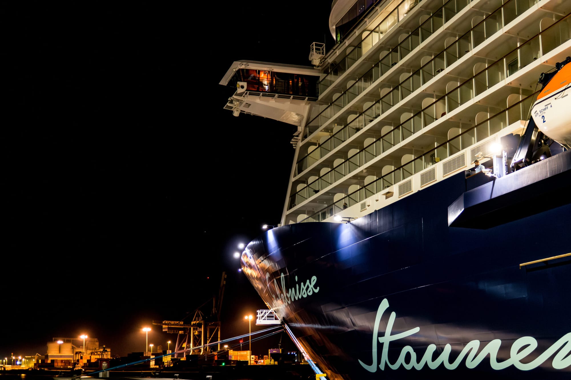 Je mehr man sich dem Hafen nähert, umso mehr ist es möglich, zwischen den Gebäuden schon mal einen Blick auf das schwimmende Hotel zu erhaschen, das in den kommenden Tagen die eigene Herberge sein würde. Hach, das ist und bleibt spannend! Genauso, wie es für mich wohl immer überwältigend bleiben wird, direkt vor dem Kahn zu stehen und darüber zu staunen, wie ein derart großes, von Menschenhand geschaffenes Konstrukt überhaupt in der Lage ist, vom Wasser getragen zu werden! Und dabei sind die aktuellen Schiffe von TUI Cruises ja beileibe nicht die größten Pötte, die da über die Ozeane dampfern. Royal Caribbean zum Beispiel hat da ein paar Schiffe in der Flotte, die locker 60 Meter länger, und mit 60 Metern Breite ganz bequem doppelt so dick sind. Das muss man sich mal auf der Zunge zergehen lassen! Der Begriff „Arche“ geht einem da schon mal unweigerlich durch den Kopp.