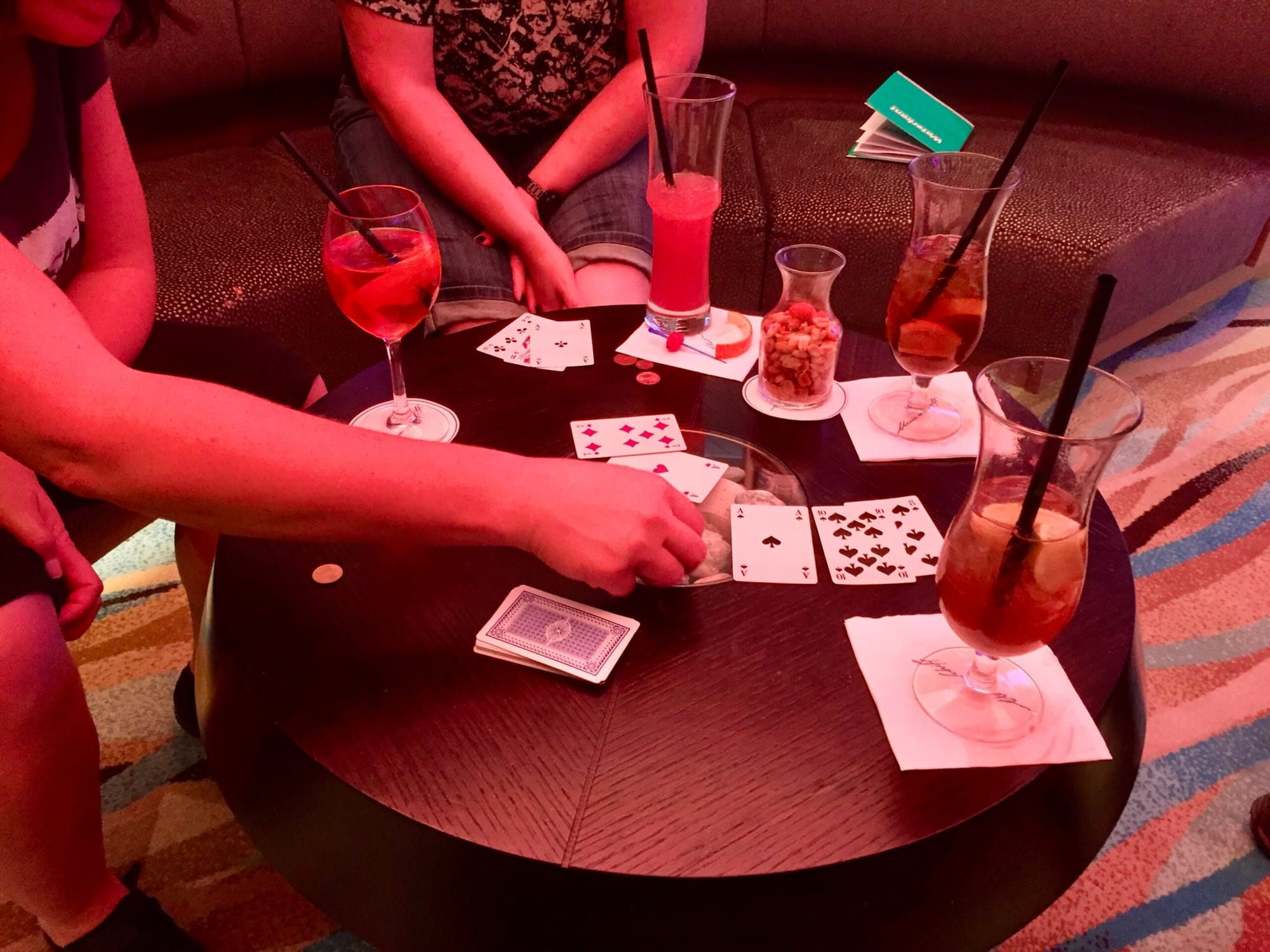 Für den Abend hatten wir uns etwas ganz Verrücktes ausgedacht: Irgendwo in eine der Bars hocken und ein Gesellschaftsspiel spielen! Ernsthaft jetzt. In die Auswahl kamen Monopoly, was leider an Bord nicht verfügbar war, und ein Kartenspiel. Und so wurde es das. Freud und Glück sind bekanntlich auf der Seite der Narren, somit konnten wir erfreut feststellen, dass das Rondell inmitten der Waterkant Bar gerade nicht belegt war. Der Platz war in den folgenden Stunden unser. Das war schon ziemlich chillig, dort zu sitzen, Karten zu kloppen und lecker Cocktails zu schlürfen. Wobei … lecker waren die nicht. Was auch immer dort an diesem Abend schiefgelaufen ist, aber meine Bloody Marybeispielsweise war eine totale Katastrophe. Da muss gerade so viel Tomatensaft drin gewesen sein, dass sich das Zeug rot färbte – ansonsten scheinbar bis obenhin voll mit Wodka. Bei dem ohnehin schummrigen, eher rötlichen Licht innerhalb des Rondells keine Schwierigkeit. Wir mussten direkt noch mal ein ganzes Glas Tomatensaft kommen lassen, damit das genießbar wurde. Warum ich das nicht habe zurückgehen oder stehen lassen? Nun, ich wurde noch so erzogen, dass man nichts wegwirft, wenn es nicht sein muss.