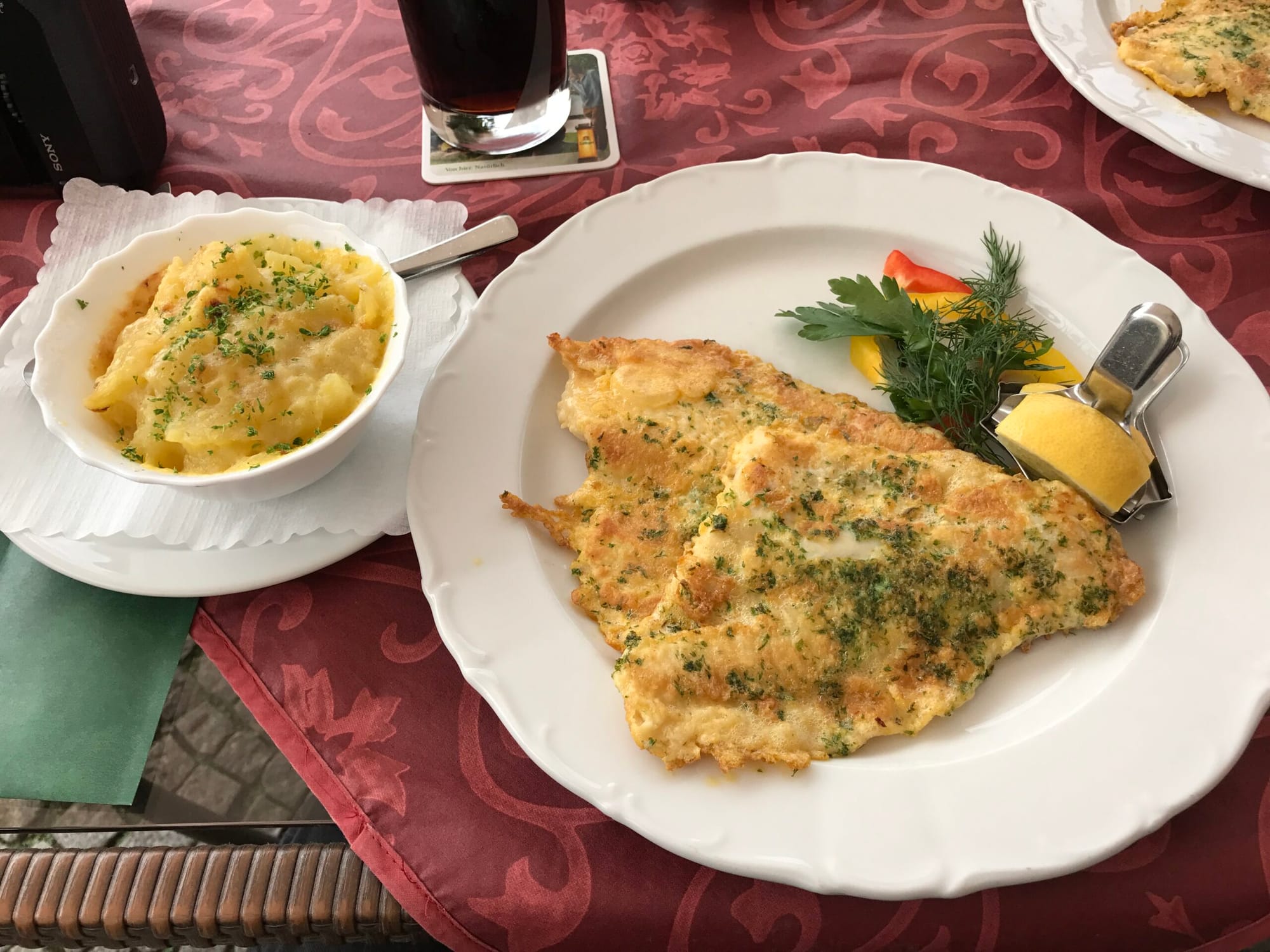Da wir uns als Ziel gesetzt hatten, gegen 20 Uhr wieder zu Hause zu sein, machten wir uns gegen 15 Uhr auf den Rückweg. Um wieder auf die A14 bzw. die B189 zu kommen, mussten wir wieder an Wismar vorbei. Und wenn wir schon mal waren … fuhren wir doch direkt noch mal rein, hielten wieder im Turnerweg (wieder reichlich Parkmöglichkeiten vorhanden!) und machten uns auf den Weg zum Marktplatz. Sinn und Zweck: noch einen Happen essen. Was wir dieses Mal im Restaurant Alter Schwede machten. Es überrascht Euch sicher nicht, dass es auch dieses Mal wieder Fisch wurde, oder? Auch im Alter Schwede lässt es sich hervorragend essen. Die Kulisse mit Blick auf das historische Wasserspiel sowie den Marktplatz ist echt toll! Zwar isst man hier etwas teurer als im Kiek in, dennoch hat sich der Aufpreis definitiv gelohnt. Daher können wir Euch guten Gewissens empfehlen: Wenn Euch Hunger und/oder Appetit auf Fisch plagen, während Ihr in Wismars Stadtkern unterwegs seid – der „Alte Schwede“ ist eine prima Adresse, um wirklich gut zu essen. Hier waren wir mit 40 € für zwei Personen inklusive Getränken dabei.