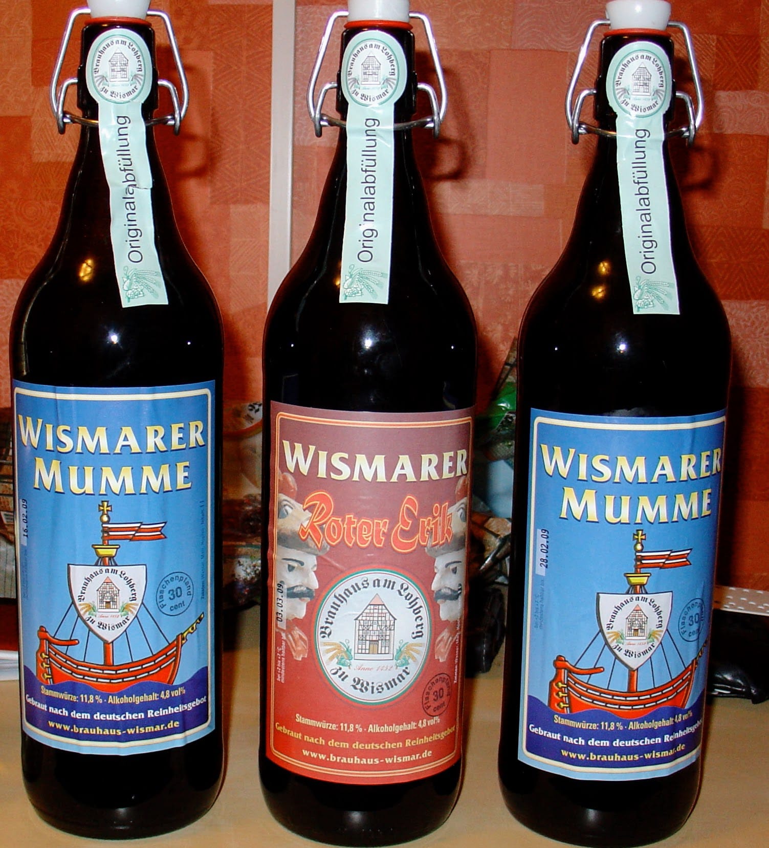 Nachdem wir staunend über den Marktplatz flaniert sind, führte uns unser Weg vorbei am Haupt- und dem Busbahnhof (sehenswert entlang des Weges: die städtische Warmbadeanstalt. Laut Beschriftung die Badeanstalt der Werktätigen.) zum Hafen. Dort gibt es nicht nur viele Restaurants und Cafés, die zum Verweilen und Schlemmen einladen, sondern auch das Wismarer Brauhaus. Dort könnt Ihr unter anderem ziemlich leckeres Bier aus eigener Produktion erwerben. Entweder zum Trinken vor Ort – was sich gerade im Sommer echt anbietet, so ein Roter Erik schmeckt in der historischen Kulisse mit dem historischen Wassertor und diesem merkwürdig schiefen Haus, dem Gewölbe aus der Mitte des 17. Jahrhunderts (Ihr erkennt es, wenn Ihr es seht) einfach gleich nochmal so gut! – oder zum Mitnehmen. Nicht kleckern, klotzen ist die Devise. Das Bier zum Mitnehmen wird in überschaubaren 1-Liter-Flaschen verkauft. Aus Glas. Mit Plopp-Verschluss.