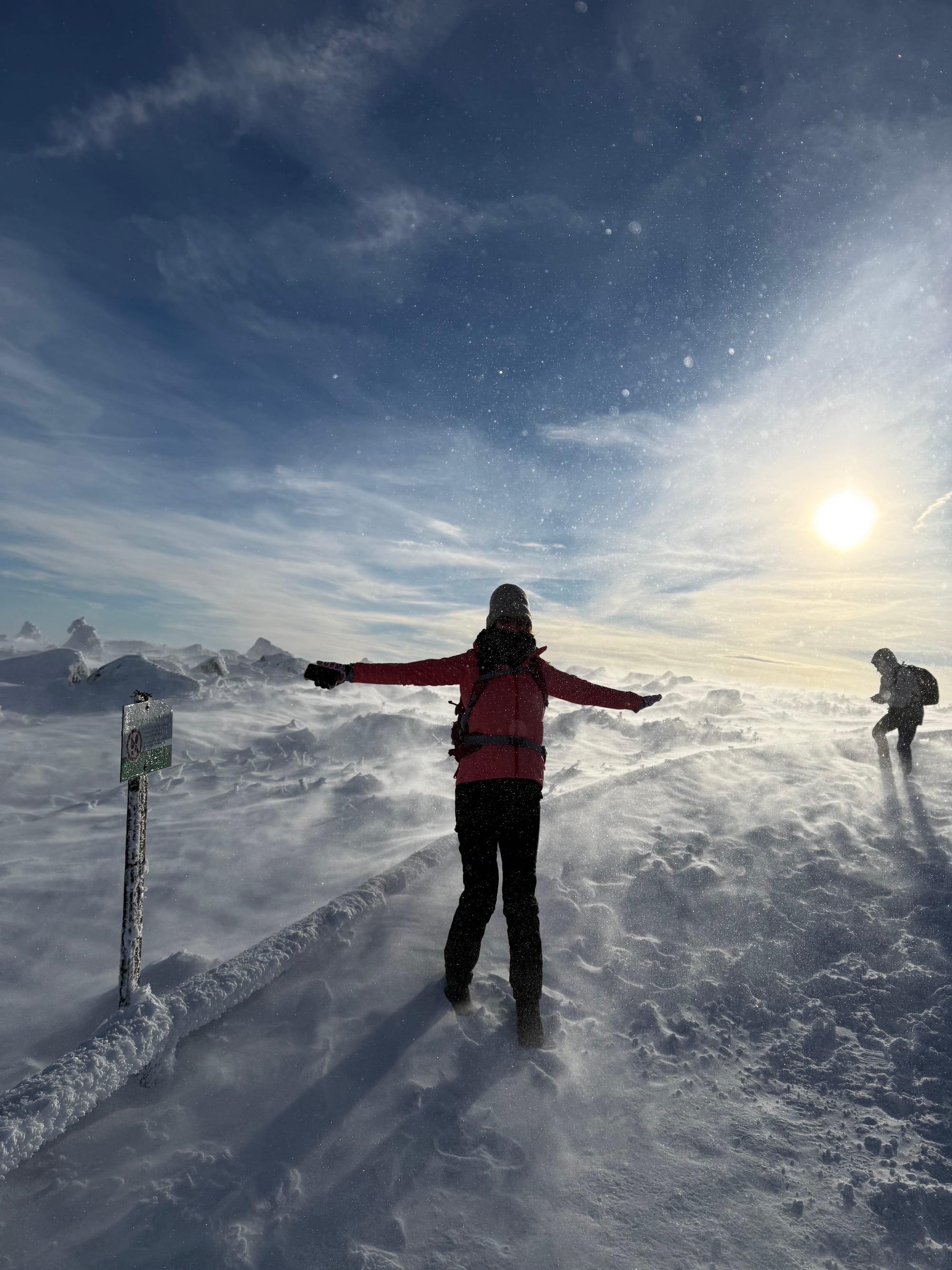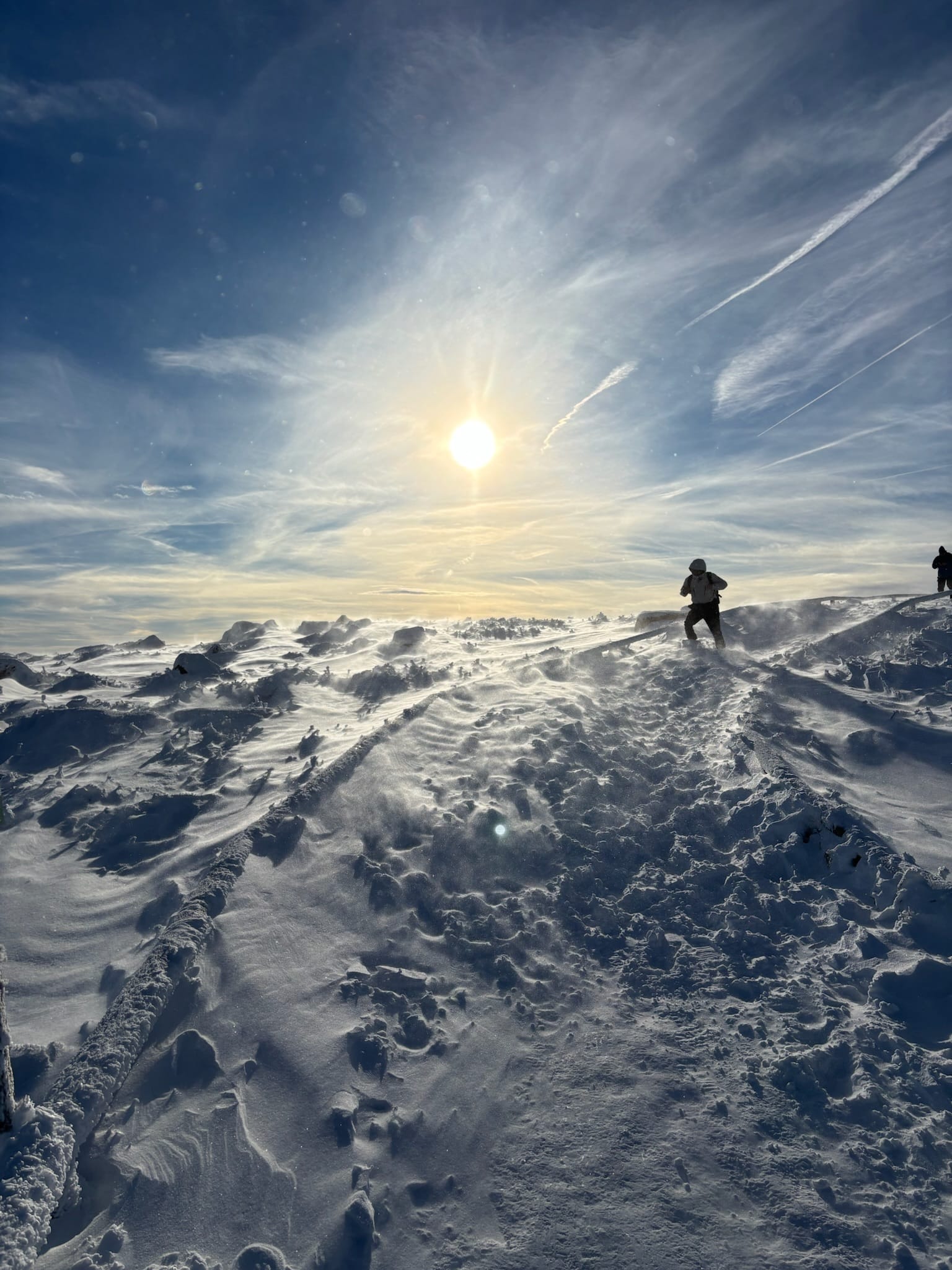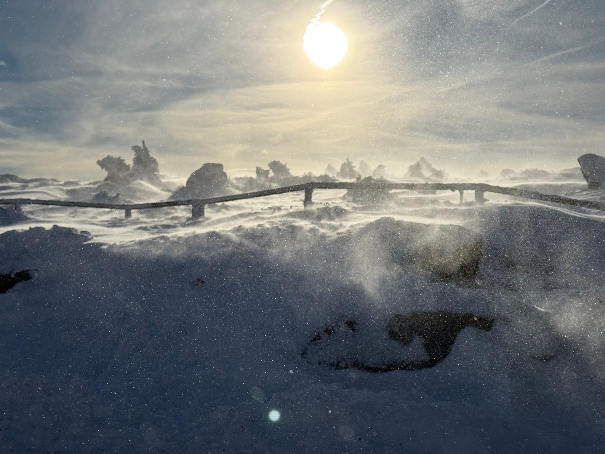 Die letzten anderthalb Kilometer bis zum Brocken rauf verliefen dafür auf asphaltierter Straße. Hier bestand die Schwierigkeit vorwiegend in der Steigung. Je mehr wir uns dem Ziel näherten, umso windiger und kälter wurde es. Und oben dann: eiskalter, schneidender Wind, der mit böig noch sehr wohlwollend umschrieben ist. Tatsächlich pfiff dort oben derart stark der Fuchs, dass man sich richtig reinlehnen musste, um vorwärtszukommen. Und die Mütze festhalten, die hätte andernfalls sonst vielleicht den Freiflug nach Braunlage gewonnen. Oder wenigstens bis zum Schloss Wernigerode. Noch dazu Schneeverwehungen, die sich wie hunderte kleiner Nadelstiche im Gesicht anfühlten! Ihr kennt sicher alle Szenen aus irgendwelchen Filmen, in denen Menschen stehenden Fußes gegen den Sturm anmarschieren und gefühlt gar nicht vom Fleck kommen, oder? So in etwa könnt Ihr Euch das vorstellen.