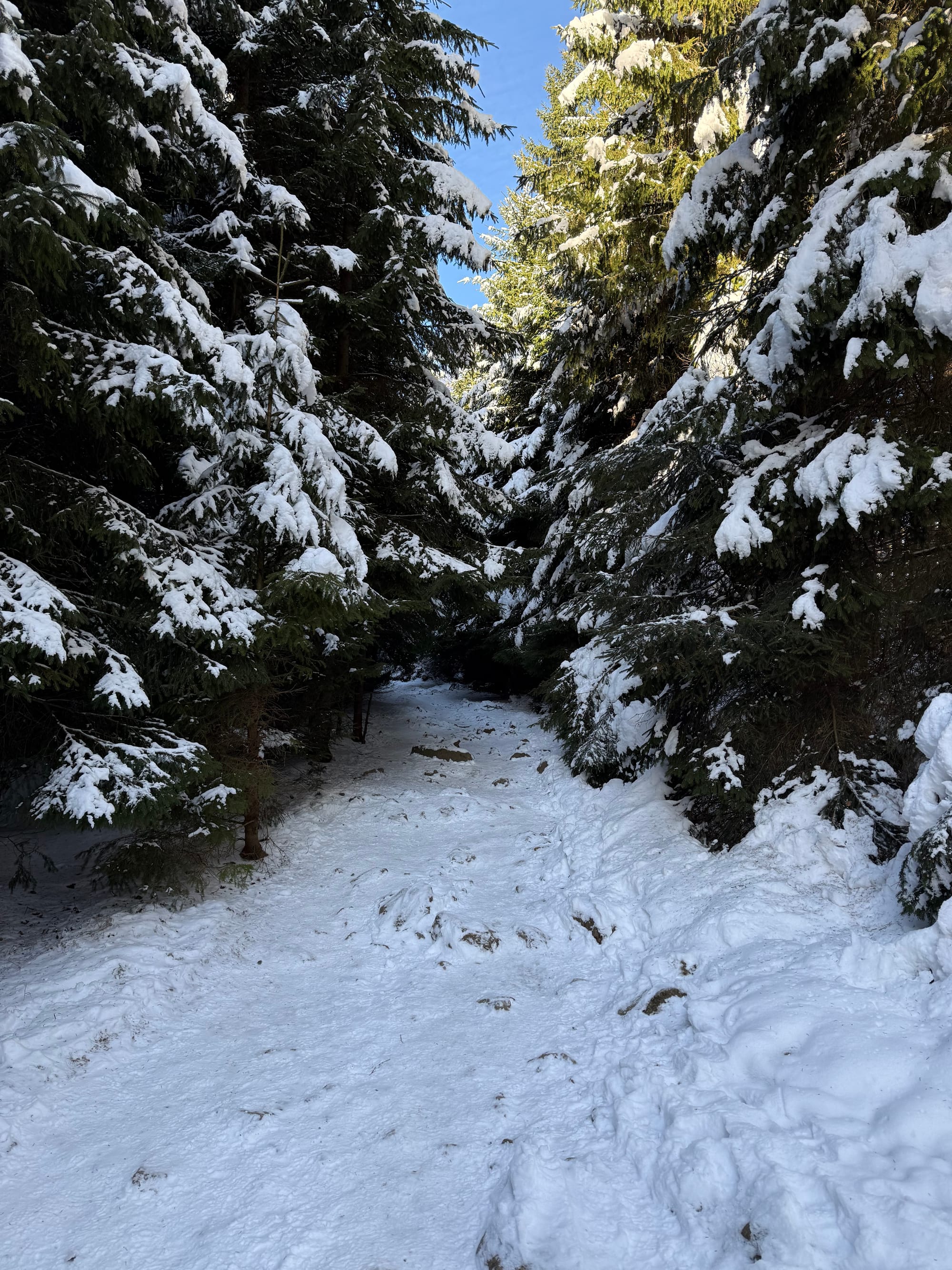 Für den Weg zum Brocken rauf entschieden wir uns für einen Pfad, der bis dato nur wenig genutzt worden zu sein schien. Jedenfalls, seitdem der Schnee gefallen war. Es ging steil aufwärts mit uns. Über zugeschneite und gefrorene Stöcker und Steine. Schön vorsichtig, denn unter dem Schnee war es teilweise auch tüchtig glatt. Und wir wollten ja nicht direkt gleich auf der ersten Etappe den Frosch machen, wa? Wer, wie ich, so einen Aufstieg durch derartiges Gelände in Tateinheit mit einem solchen Wetterchen noch nicht gemacht hat, empfindet das möglicherweise als abenteuerlich. Ging mir jedenfalls so. Es ist eben doch etwas anderes, als der übliche Sonntagsspaziergang.