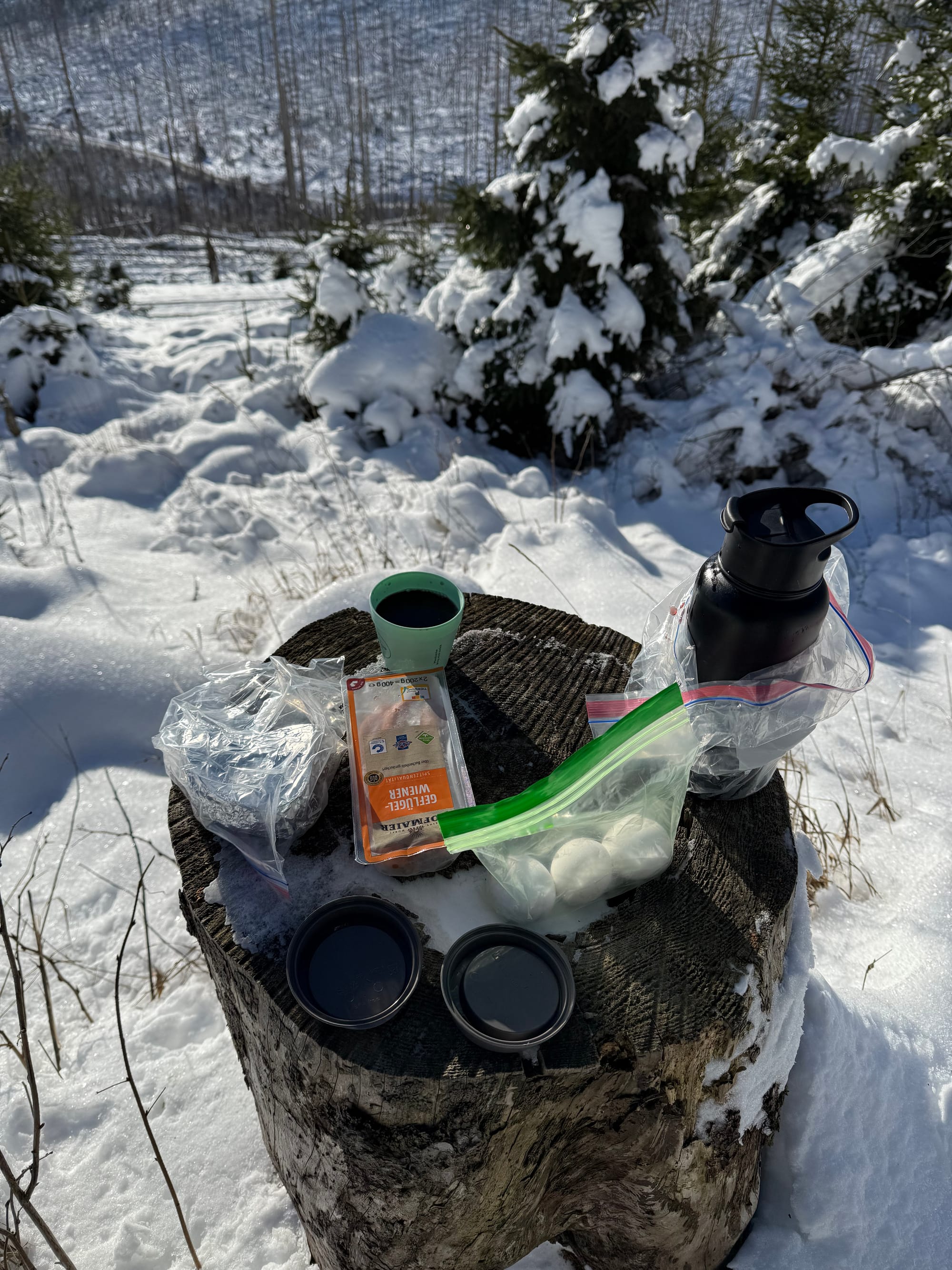 So aber erreichten wir unseren angepeilten Parkplatz in Schierke gegen 10 Uhr. Die Sonne lachte uns vom blauen und kaum bewölkten Himmel bereits entgegen. Sie schuf damit gute Rahmenbedingungen, uns vor Ort noch schnell in die diversen Schichten von Klamotten zu zwängen. Zwiebellook FTW! Und dann ging es auch schon los. Wie üblich hatten wir wieder einiges an Proviant dabei. Geschmierte Stullen, Tee in Thermosbechern, Glühwein (versteht sich von selbst, ne?), Wasser mit Elektrolyten, gekochte Eier, Wiener Würstchen. Im Prinzip schon fast unser reguläres Set-up für solche Aktionen. Nur dass das weinhaltige Erfrischungsgetränk je nach Jahreszeit variiert. Im zweiten Rucksack hatten wir weitere Klamotten dabei. Unterhemden, weitere atmungsaktive Funktionsoberteile, Ersatzsocken und so weiter. Um je nach Bedarf der Zwiebel weitere Schichten hinzufügen oder aber durchgeschwitzte Teile austauschen zu können. Denn dieses wunderschöne Winterwunderland, durch das wir im Begriff waren zu stapfen, brachte es naturgemäß mit sich, dass die Temperaturen nach wie vor sportlich frisch waren. Hey, wer hat hier gerade „arschkalt“ gerufen? Kalt kann dir werden, nur anfangen zu frieren solltest du nicht. Dann haste verloren.