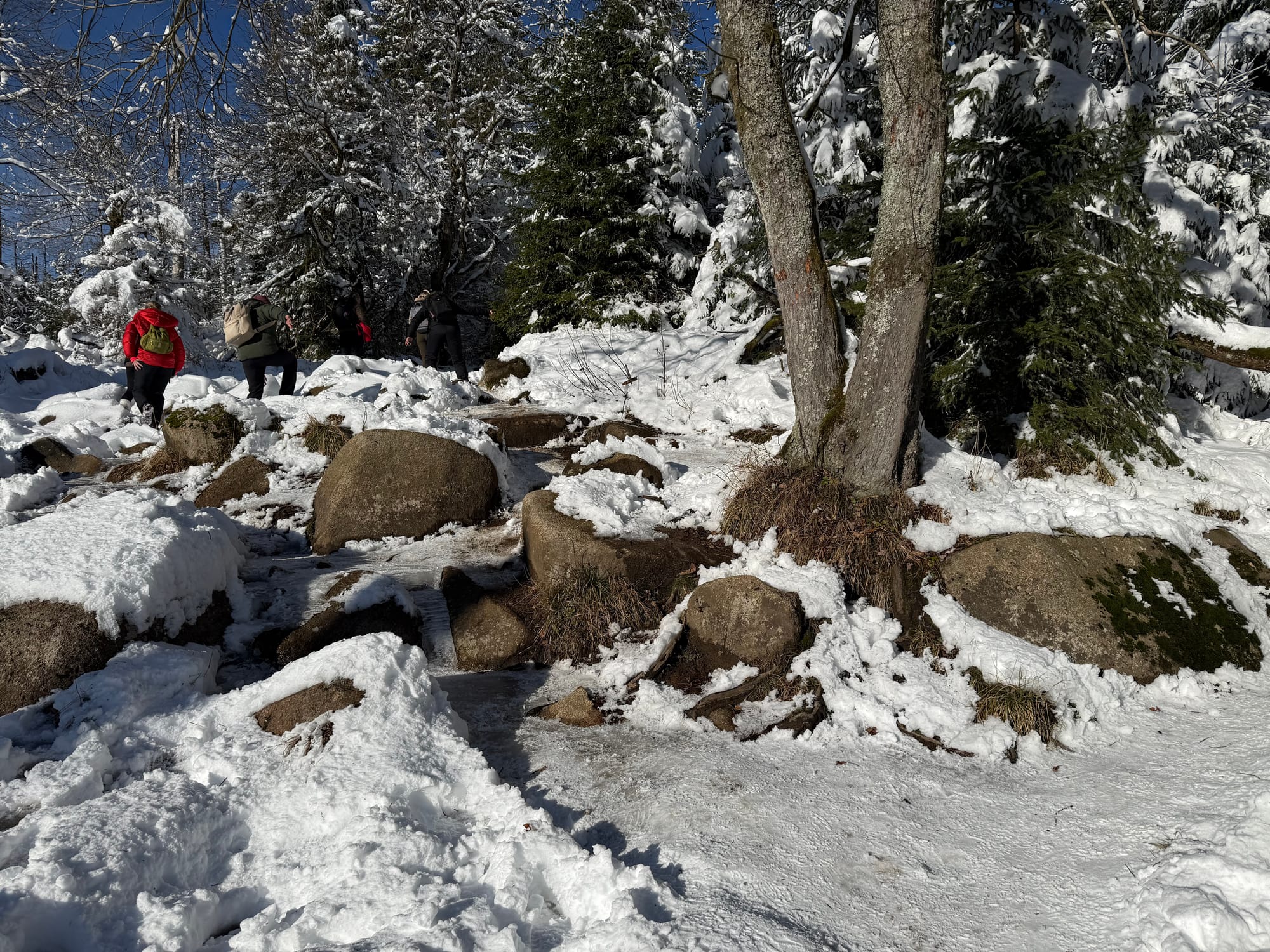 Toll auch der Weg den Eckerlochstieg hinauf. Das ist für Ungeübte wie mich eine Herausforderung. Nachdem ich, Schnee und Glätte sei Dank, mich tatsächlich auch zweimal lang gemacht hatte, schon dachte, hier meinen Endgegner gefunden zu haben, überkam mich wieder dieses wohlige Gefühl, etwas geschafft zu haben, nachdem wir diese Passage hinter uns gebracht hatten. Lang ist dieser Weg nicht, aber sehr steil, sehr unwegsam und bei diesen Witterungsbedingungen vielleicht auch nicht ganz ungefährlich. Aber so wie Nicole gab es an jenem Tag auch diverse andere Wandersleute, die diesen Weg offensichtlich nicht zum ersten Mal gingen und in einem Affenzahn den Felsen hinaufkraxelten! Das kann schon mal ein bisschen anstrengend sein, wenn man dazu neigt, sich davon unter Druck gesetzt zu fühlen. Aber gut, irgendwann ist auch die eifrigste Meute an einem vorbei und der Weg kann ungestört fortgesetzt werden.