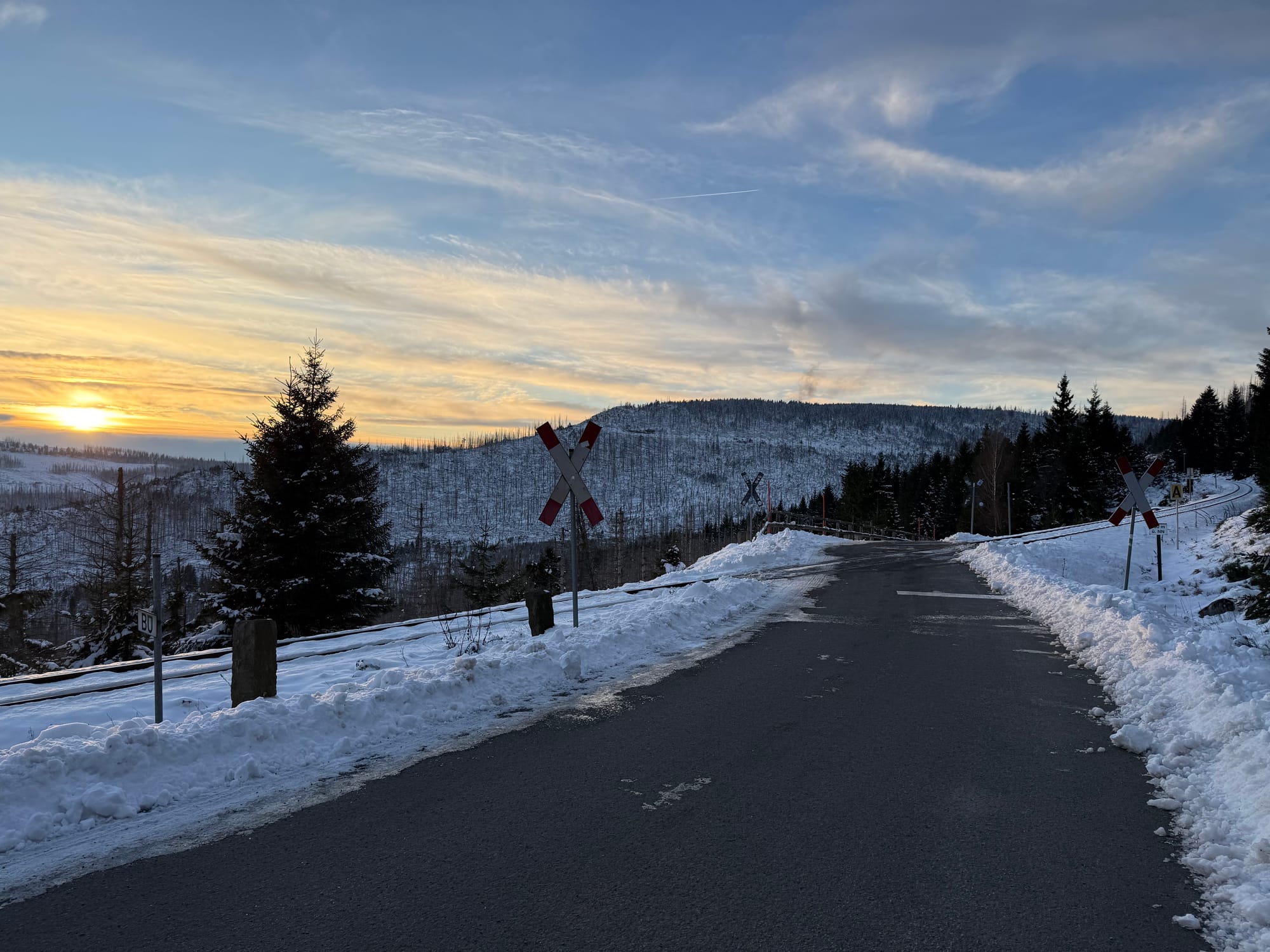 Wir kehrten noch einmal kurz für eine Tasse Grog bzw. Jagertee im nahegelegenen Brockenwirt ein, um uns noch ein wenig aufzuwärmen und ein paar Klamotten (Weste, Jacke) zu trocknen, ehe wir dann den Weg zurück nach Schierke antraten. Dieses Mal folgten wir allerdings nur der Straße, etwaige Ausflüge durchs Gestrüpp verkniffen wir uns aufgrund der Tatsache des zeitigen Sonnenuntergangs. Bei Schnee und Eis wollten wir uns nun wirklich nicht in der Dunkelheit durchs Unterholz schlagen. Gegen 17 Uhr und somit in nachtschwarzer Dunkelheit erreichten wir wieder das Auto und traten die Heimreise an.