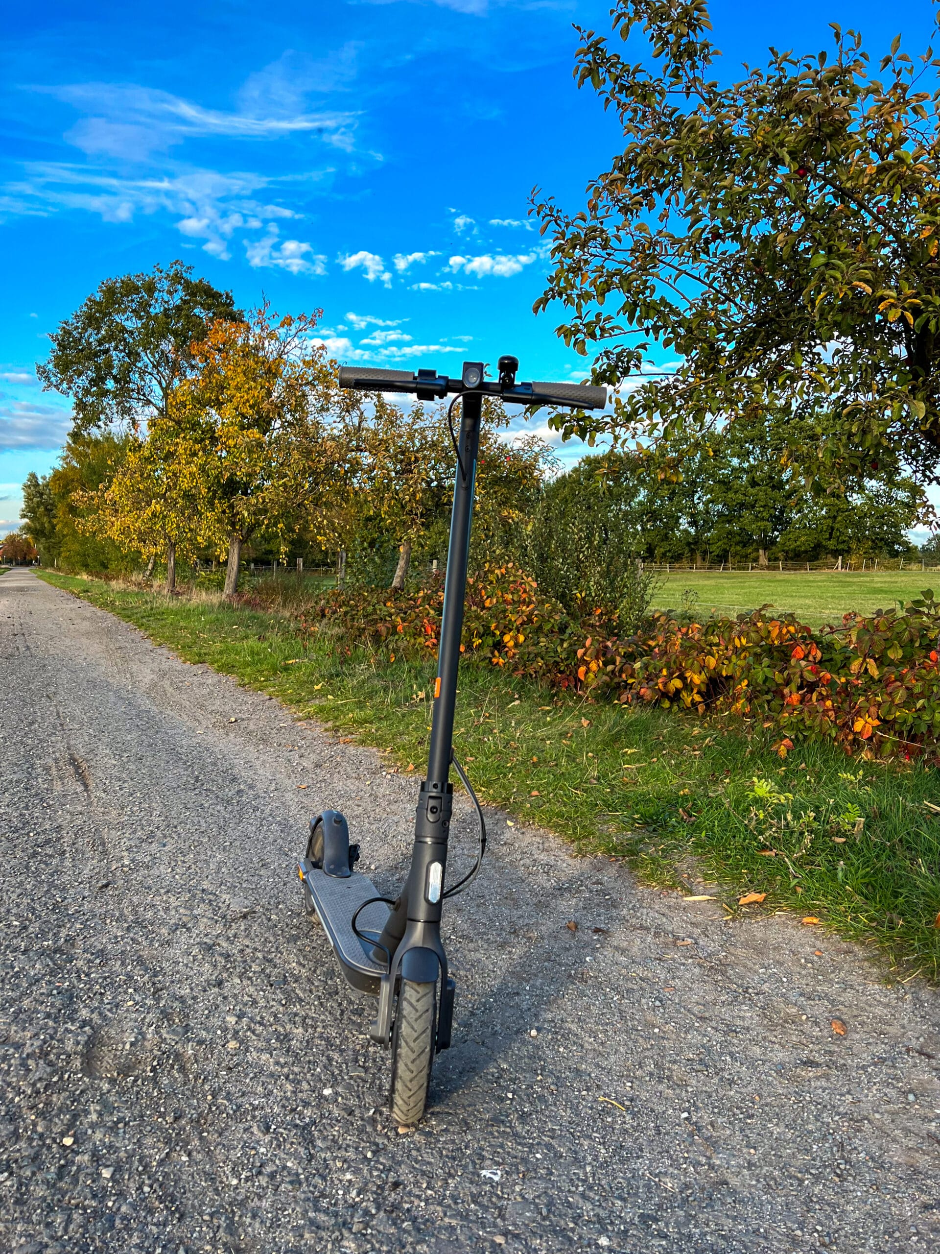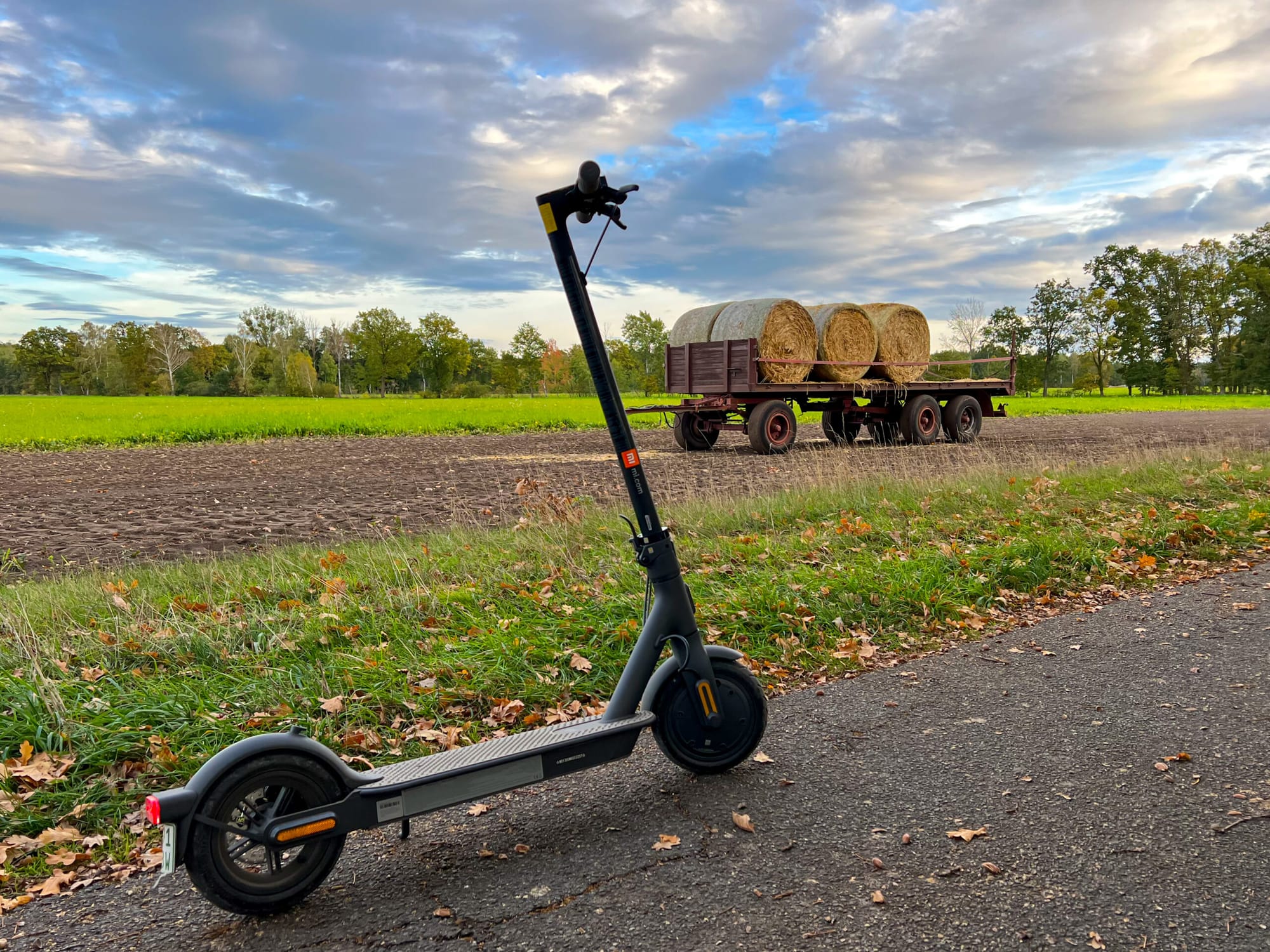 Die Beschreibung dieses Gefährts, wie sie beispielsweise bei Amazon zu finden ist, erklärt mir, bei dem Mi Scooter 1s handele es sich um einen E-Scooter mit Straßenzulassung (ABE) zur Nutzung auf öffentlichen Straßen, der im Sport-Modus eine Geschwindigkeit von bis zu 20 km/h erreichen könne. Na, das wollte ich doch mal sehen! Mit vollgeladenem Akku machte ich mich auf die Spur, rollernd die nahen Feld- und Radwege der niedersächsischen Provinz zu erkunden.