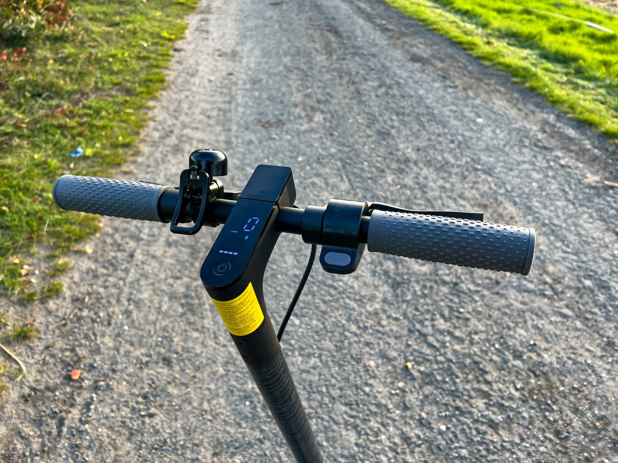 Im Stand auf einen Knopf drücken und ab dafür? Na, fast. Der Schalter, der zur Justierung der Geschwindigkeit auf der rechten Seite der Lenkstange angebracht ist, versetzt den E-Scooter erst ab einer Geschwindigkeit von 5 km/h in Bewegung. Das heißt also: einmal kurz per pedes Schwung holen, schnell noch das Schwungbein nachziehen und aufpassen, den Schalter nicht direkt volle Pulle aufzudrehen – oder sich wenigstens gut an der Lenkung festzuhalten, andernfalls droht die Gefahr des kunstvoll auf die Fresse Fliegens! Der E-Scooter beschleunigt nämlich ziemlich flott, und kaum, dass der zweite Fuß nachgezogen wurde, stehen auch schon 20 km/h auf der digitalen Anzeige und der Fahrtwind weht einem um die Nase. Huuuiiiii!
